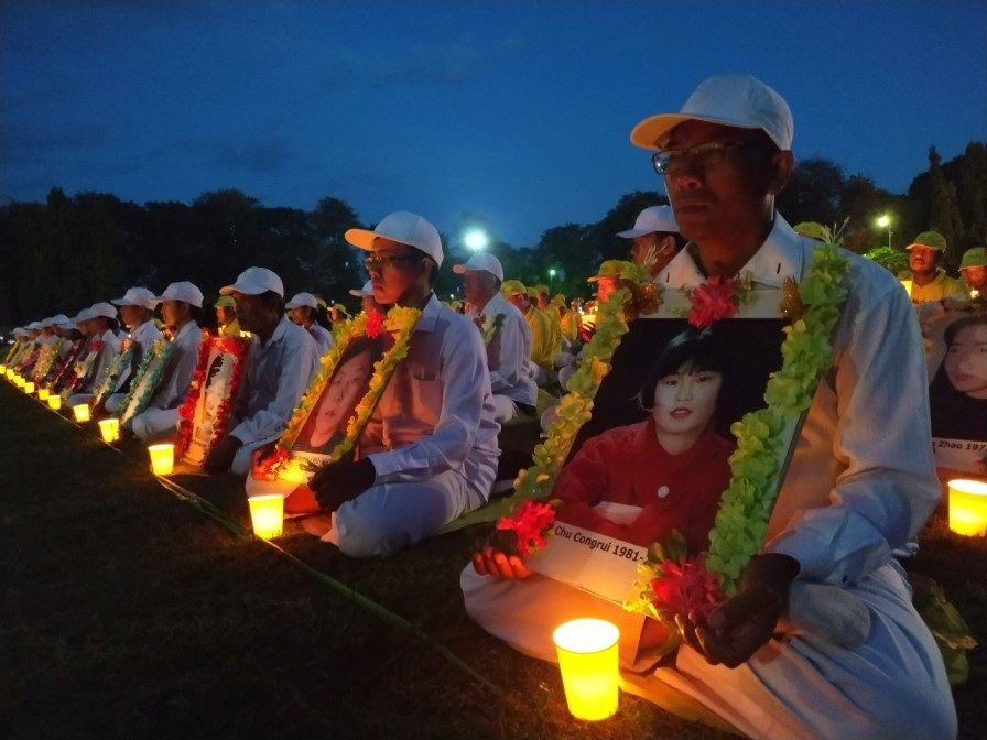烛光夜之前,由学员组成的腰鼓队出场演奏,向世人传播大法福音。夜幕降临时,一盏盏烛光在广场闪亮,悼念在中国被中共残酷迫害致死的四千八百多名法轮功学员。非常醒目显著的大型照明灯写着“结束长达23年对法轮功的迫害”(End 23 Years Persecution of Falun Gong),向民众传递明确的信息。