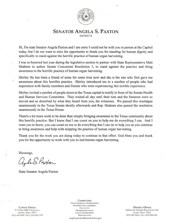“我是德州参议员安吉拉·帕克斯顿(Angela Paxton),很抱歉我今天不能亲自在州议院与你们见面,但我不想错过机会感谢你们支持人类尊严,特别是反对可怕的活摘人体器官的实践。