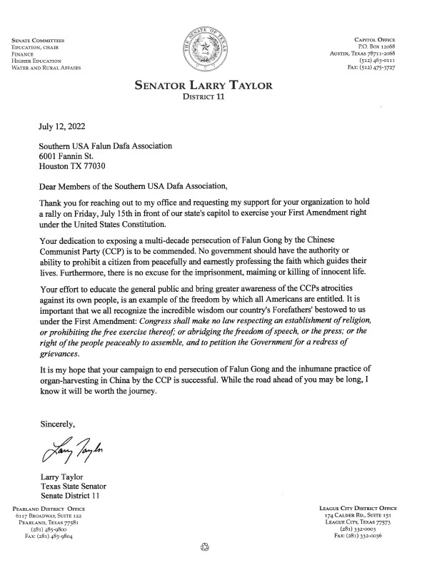 德州参议员拉里·泰勒:你们致力于反迫害值得赞扬