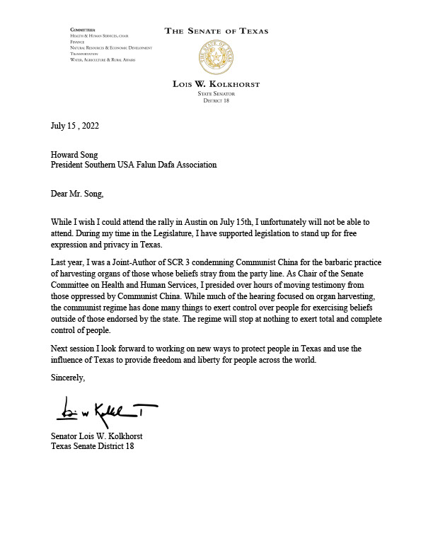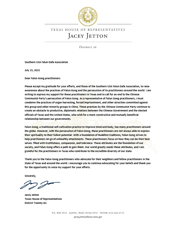 “尊敬的法轮功学员。请接受我的谢意,感谢你(们)和美国南部法轮大法学会为提高人们对法轮功修炼和世界各地法轮功学员受迫害的认识所做的努力。我写这封信是为了表达我对德州这些修炼者的支持,并呼吁结束中共的迫害。