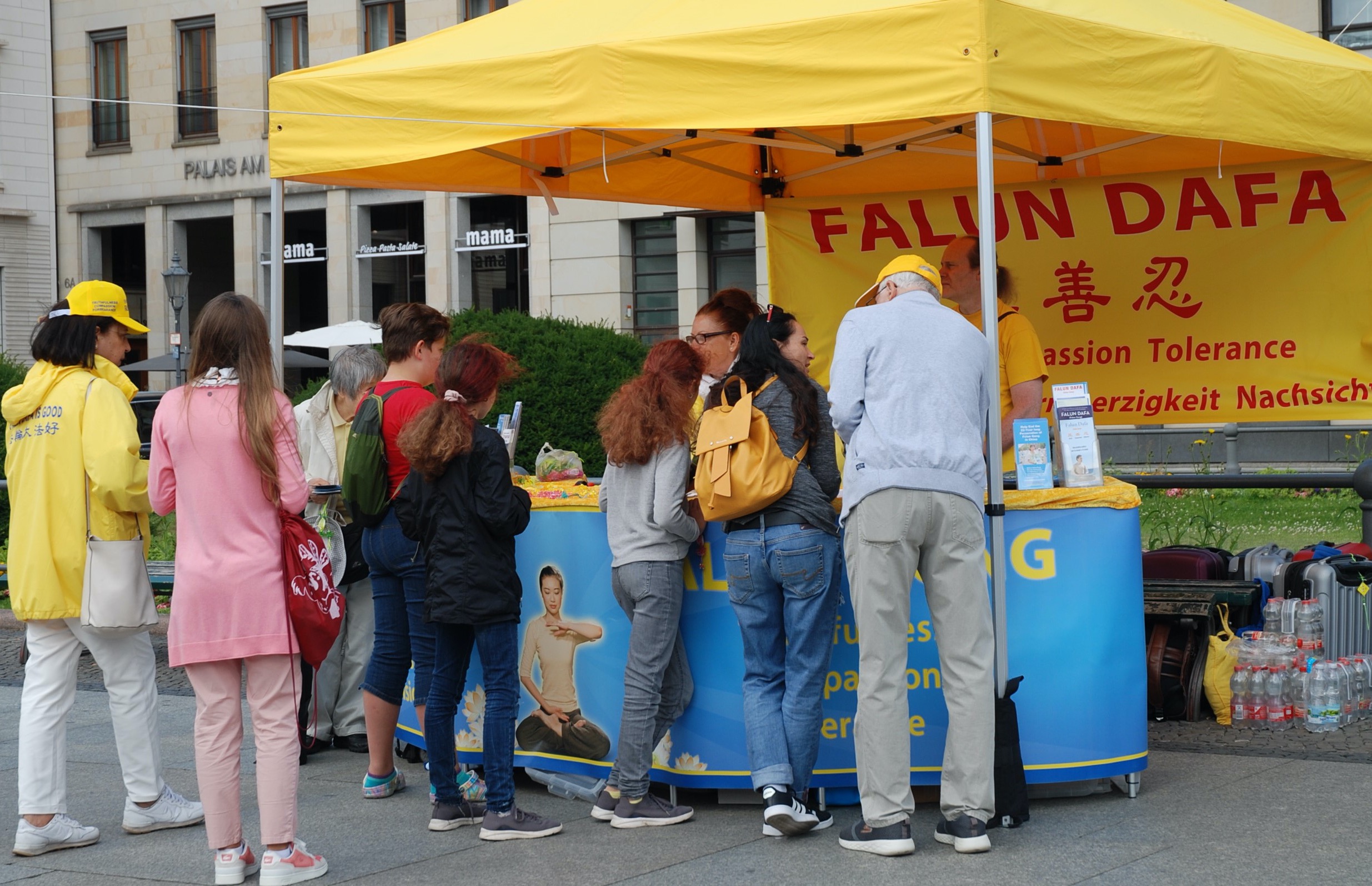 每个周六,人们在勃兰登堡门前的巴黎广场,会看到有一道不一样的风景线,在广场右侧打出的大型横幅告诉游客:按照真、善、忍生活的法轮功学员,在中国遭到中共二十三年的迫害,被非法关押,酷刑折磨,甚至被活摘器官杀戮。