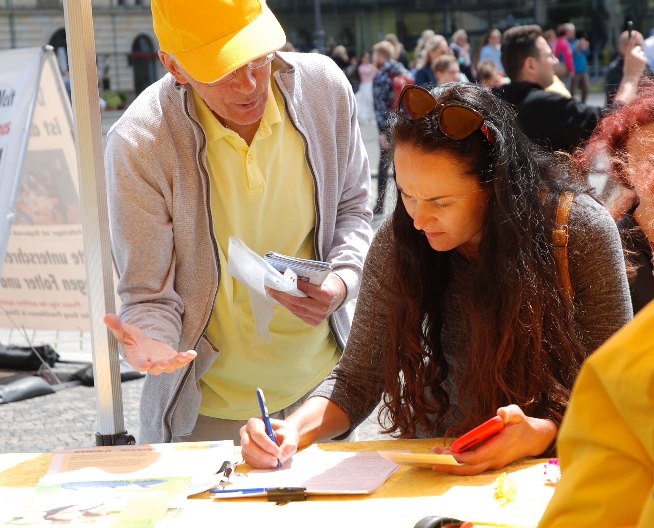 来自千里之外的康斯坦斯(Konstanze)三周前在科隆第一次听说中共活摘法轮功学员器官的罪行,当天来到柏林勃兰登堡门前,看到法轮功学员的活动,她签名表示支持法轮功学员:“我感到生命是宝贵的。活摘器官必须被制止,对人权的迫害必须被制止。”她也希望通过签名:“可以让更多的人知道中共罪行,尽早结束这场迫害。”
