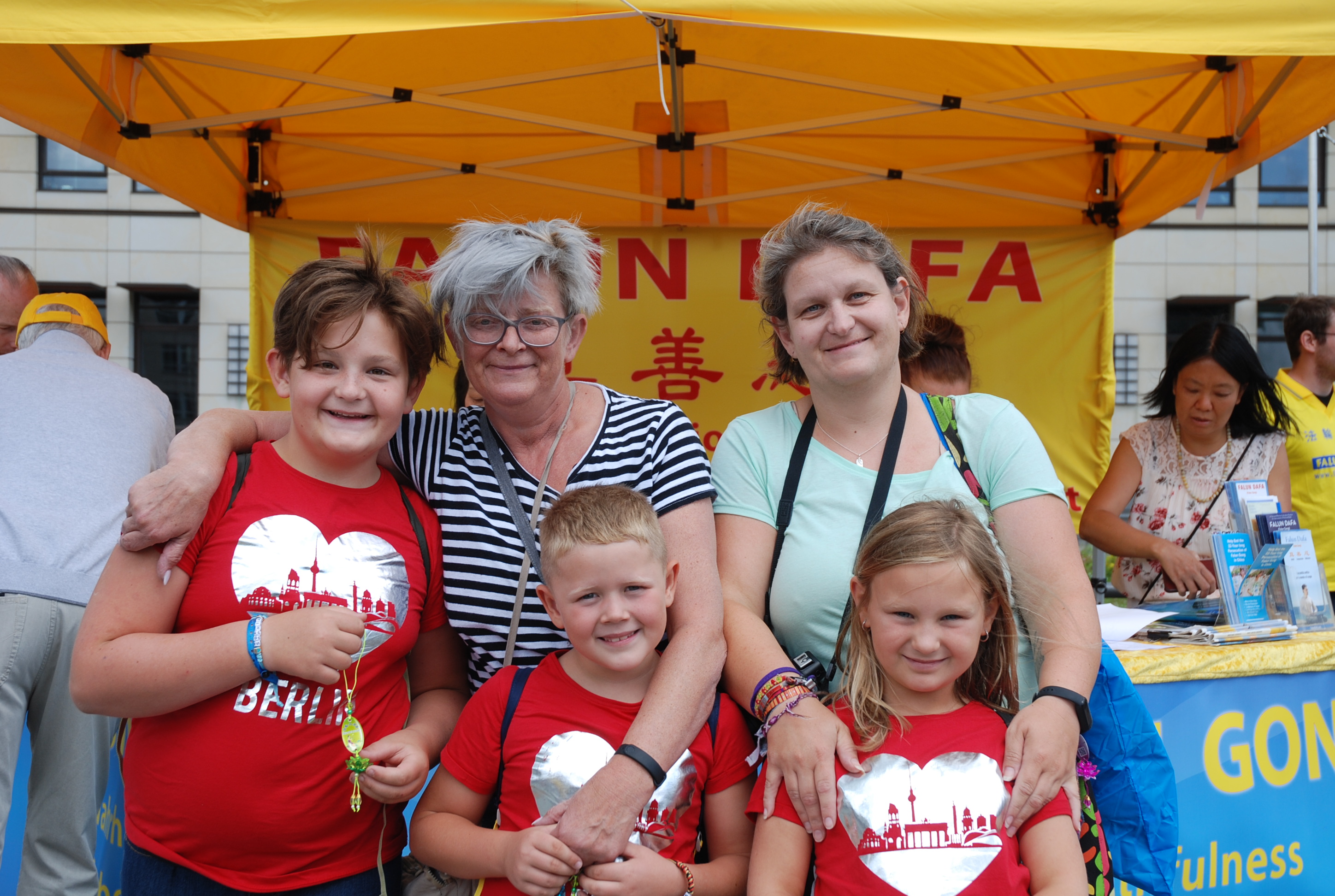 同时法轮功学员也会随着优美的音乐展示舒缓的五套功法,与路人交谈,讲述自己修炼法轮大法后身心受益的故事,让人们了解大法的美好。面对来自世界各地的游客,学员们可以用中、德、英、法、俄五种语言流利清楚地讲述真相。