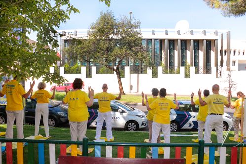 图6~9:西班牙法轮功学员中使馆前举办反迫害23年集会。图中学员在演示法轮功功法。