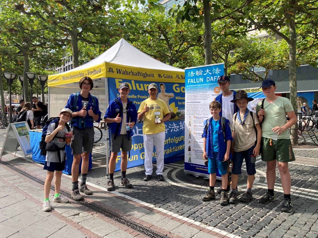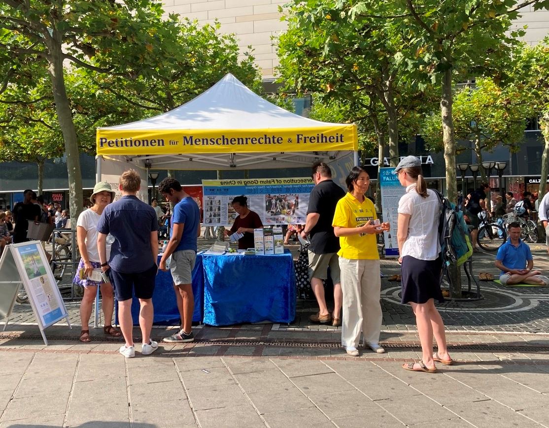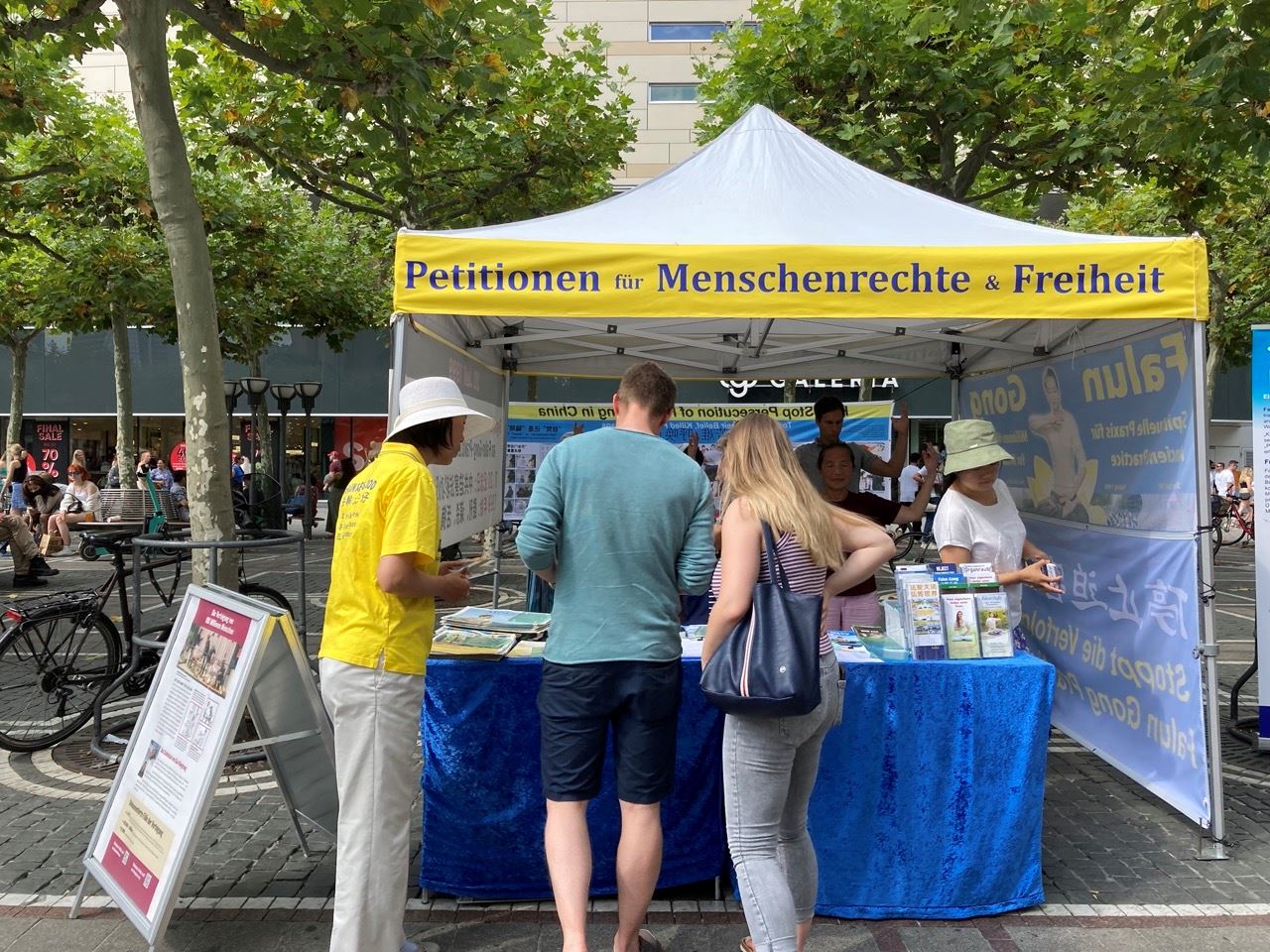法兰克福是个大都市,大量游客前来购物、游玩。多年来每个周六在市中心的不同地点都可以看到法轮功的信息台。很多人在一走一过中接到了法轮功学员发的传单。很多人主动来信息台了解详细情况,并签名声援法轮功。