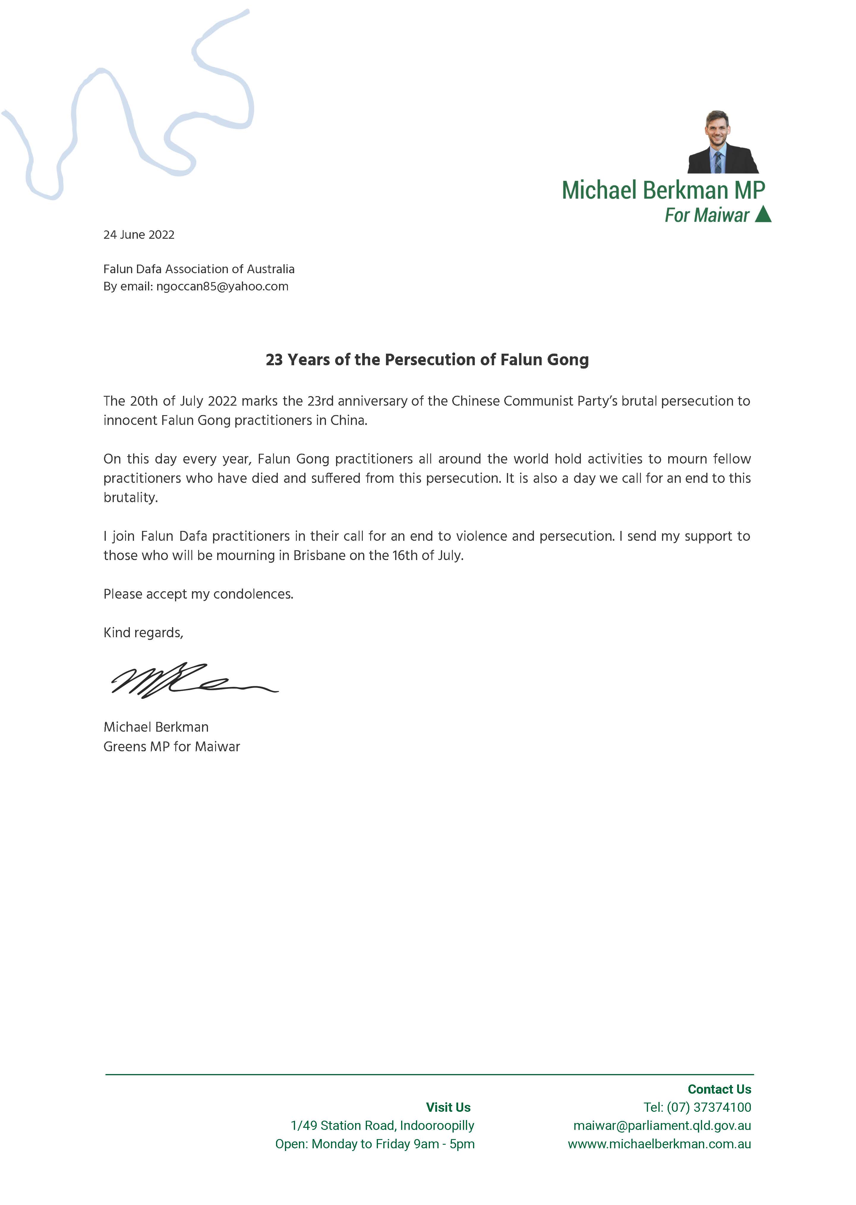 澳洲昆省绿党议员、昆士兰绿党的气候行动、就业、公正和环境问题发言人迈克尔・伯克曼(Michael Berkman MP, Member of Queensland Legislative assembly)说:“二零二二年七月二十日是中国大陆无辜的法轮功学员被中共残酷迫害的第二十三年。每年的这一天,世界各地的法轮功学员都会举办活动,悼念被迫害致死的法轮功学员。这一天也是我们呼吁终止这种暴行的日子。