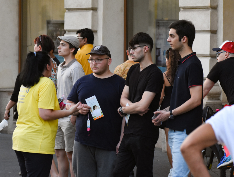 有不少行人路过时询问到底发生了什么,他们索取了真相传单和莲花结。来自国外的游客也在了解真相后,谴责中共的暴行。