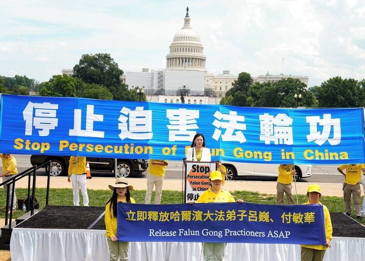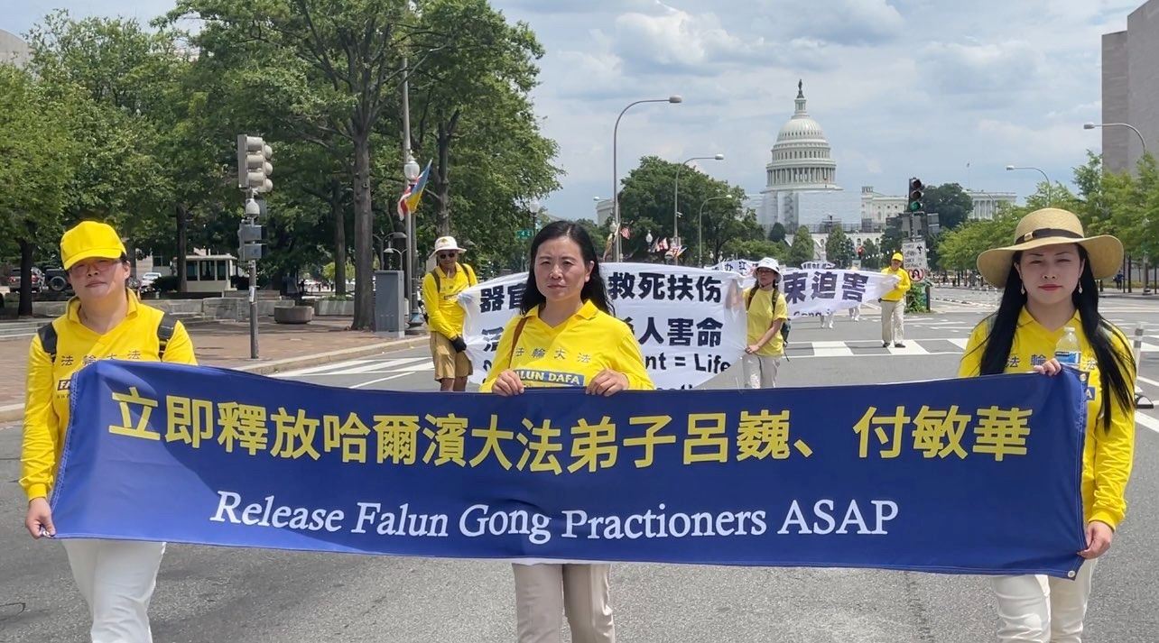 ![]() 图:二零二二年七月月二十一日,美国首都华盛顿及周边地区的部份法轮功学员举行反迫害游行,吕娜打出“立即释放哈尔滨大法弟子吕巍”横幅。 |