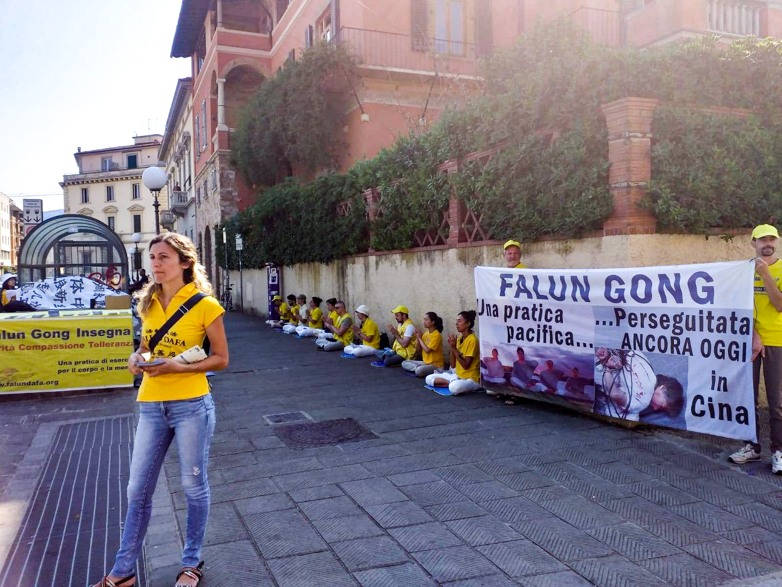 许多意大利和外国游客驻足观看,他们被悠扬的炼功音乐及优美舒缓的炼功动作以及说明迫害的海报所吸引。许多人在呼吁结束迫害的请愿书上签字。