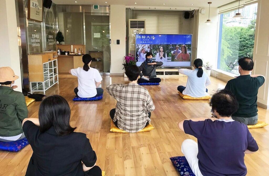 【明慧网二零二二年七月六日】二零二二年以来,越来越多的人走入了法轮大法的修炼中。法轮大法(又称法轮功)是佛家高层的性命双修功法,对身心健康有卓越效果。位于韩国首尔龙山区的天梯书店(龙山区汉江路一街),每月都会举办一次法轮大法“九天学习班”,面向市民免费教授法轮功的炼功动作和功理。