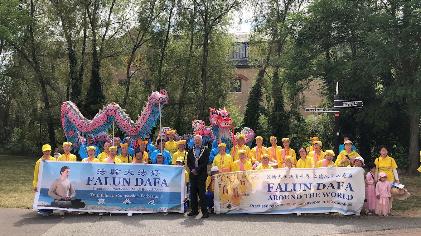 ![]() 图3:切姆斯福德市市长约翰·加利(前排中)跟法轮功学员合影 |