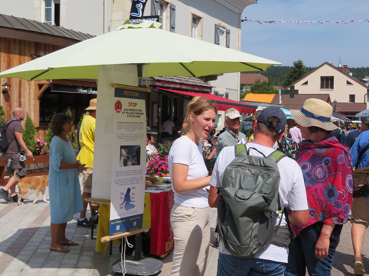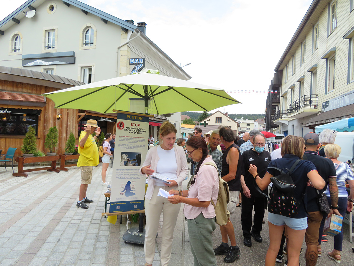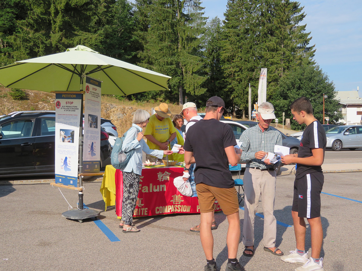 卢斯(Les Rousses)位于汝拉(Jura)山脉高处,海拔1107米,在瑞士边境,有著名的滑雪站。这里空气清新,夏季游人很多。八月五日,在卢斯市中心集市上,法轮功学员向游人介绍法轮功真相。听闻真相后的很多民众在征签表上签字,支持法轮功反迫害。