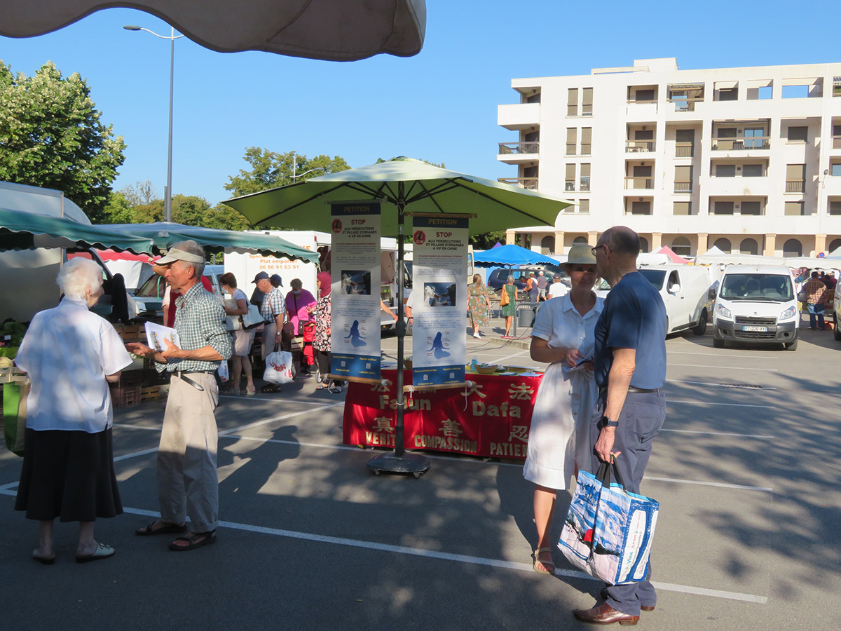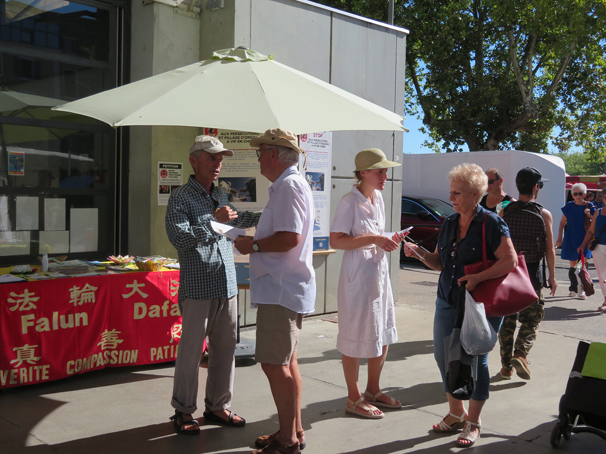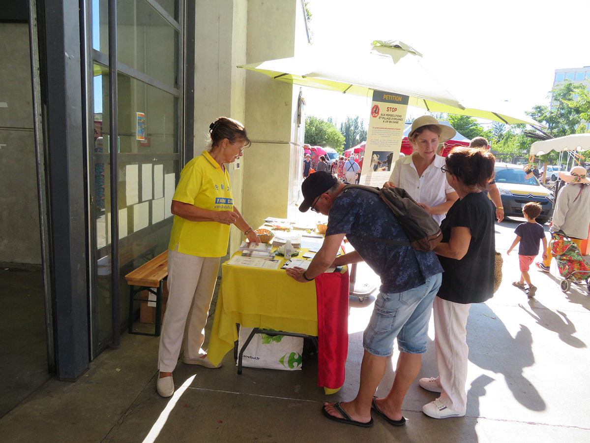 集市上,有的是农民自家种的蔬菜和水果,有些农产品如鸡蛋、面包、奶酪也都是有机食物。八月四日,法轮功学员来到龙斯勒索涅尔集市,向这里的民众和游人介绍法轮功真相。