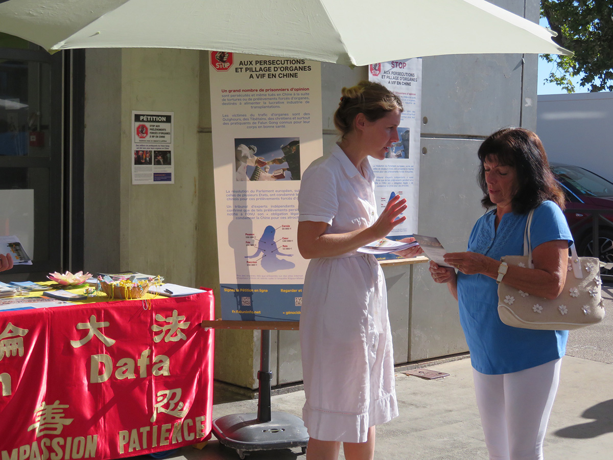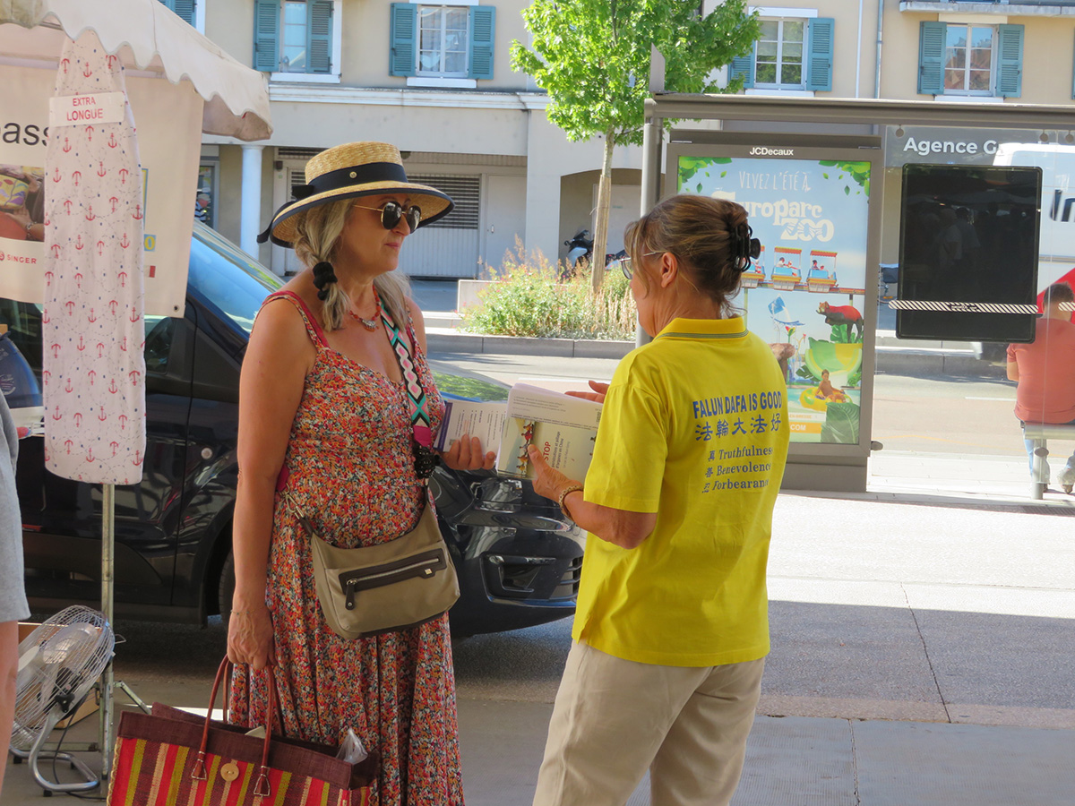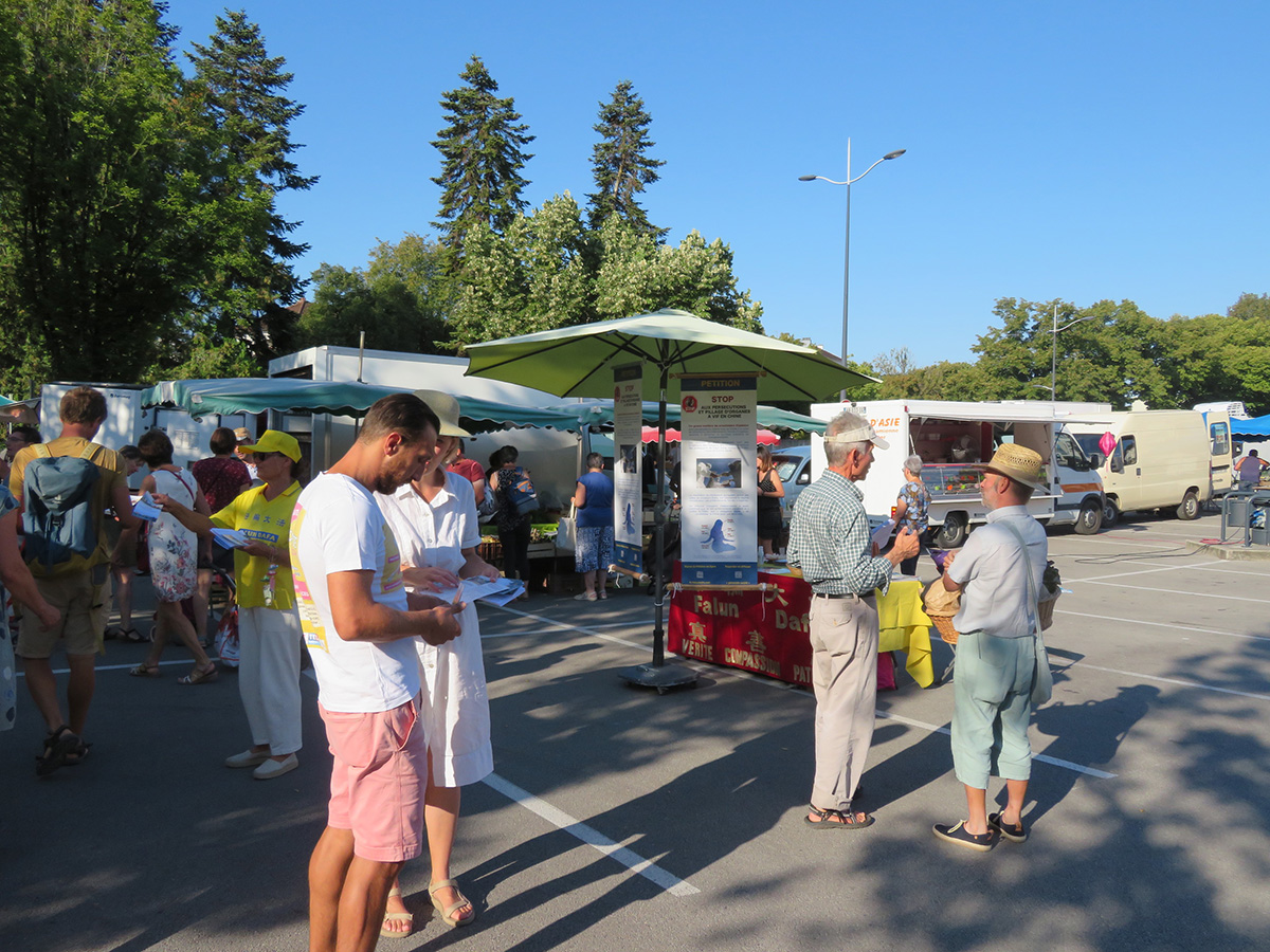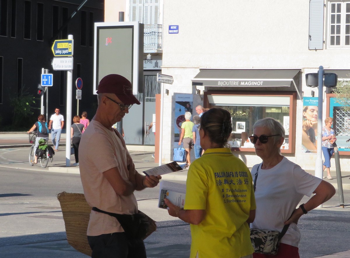 布莱斯堡(Bourg-en-Bresse)在汝拉山脉的西部,位于城市与高山之间。八月三日,法轮功学员在布莱斯堡集市向人们介绍法轮功真相。