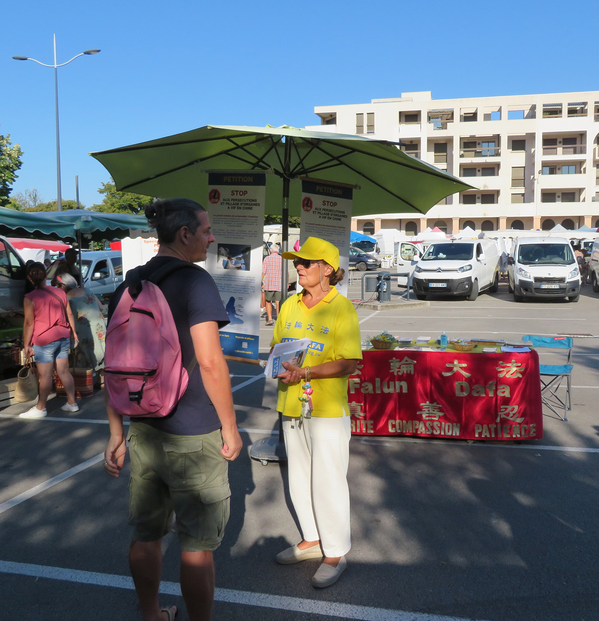 弗朗索瓦(François Pignede)和太太纳迪娜(Nadine)一同来到集市,他说:“活摘器官,我从未听说过,对我的震惊莫过于世界末日!”他赞同法轮功学员:“你们做得很好,能唤醒人们的意识,然后上升到国家、欧共体,对中共施加压力,如果世界上有一定数目的国家都起来反对这场迫害,可能推动一些事情。”