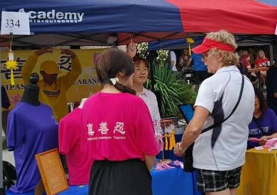 在活动现场,学员们向参加活动的当地民众介绍法轮功,讲述法轮功被中共邪党迫害的真相、征签、现场叠纸莲花、售卖艺术家品牌T恤(Artist Fashion)等。不少美国人还用中文讲出九字真言“法轮大法好,真善忍好”。有民众现场购买了《转法轮》书回家阅读。