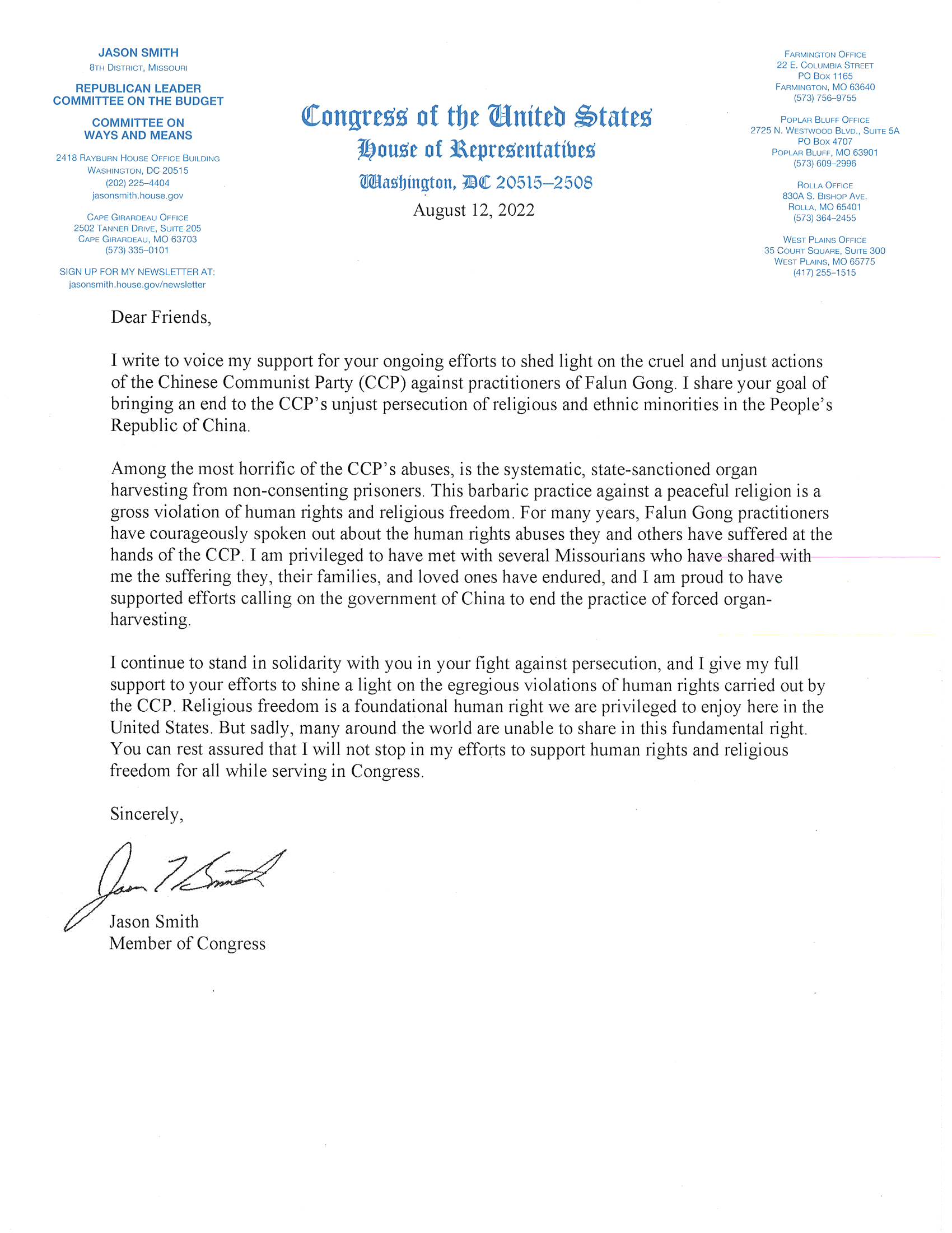 【明慧网二零二二年八月十七日】二零二二年八月十二日,来自密苏里州的美国联邦众议员杰森·史密斯(Jason Smith)为美中法轮功学员在芝加哥中领馆前的反迫害集会发来支持信。信中他表示全力支持法轮功学员努力揭露中共对人权的严重侵犯。