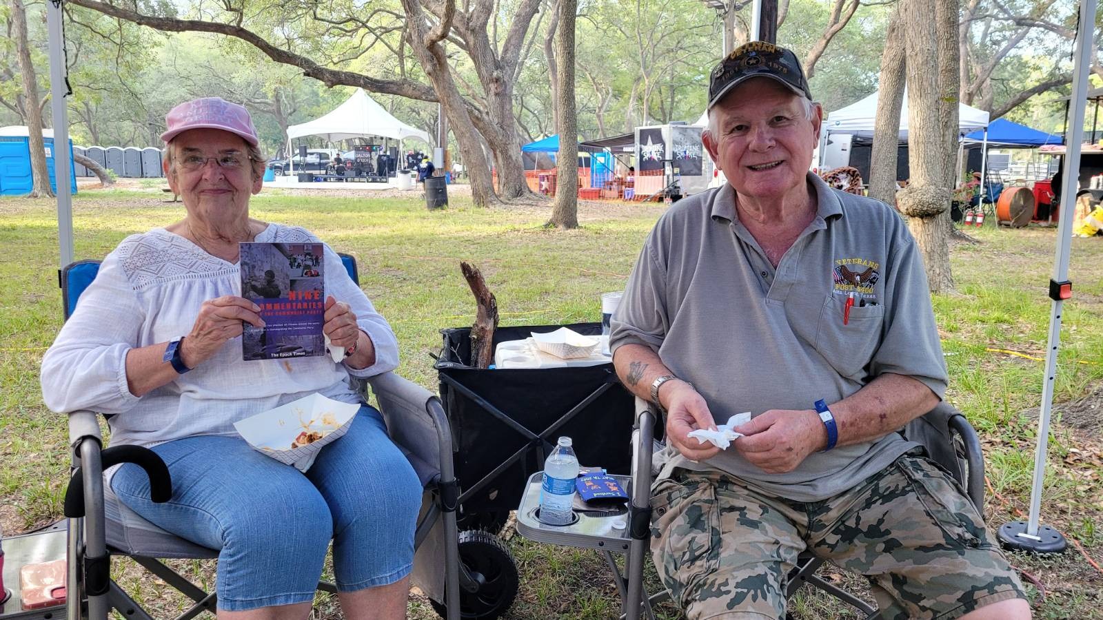 另一个摊位上的一对夫妻,妻子叫唐娜(Donna),先生叫罗伯特(Robert),学员向他们介绍法轮功及修炼法轮功的美好,包括中国的法轮功修炼者正在遭受着中共的迫害,夫妇两人欣然签名支持法轮功学员反迫害。老先生认同共产主义渗透美国无孔不入,并表示会去上网阅读《魔鬼在统治着我们的世界》和《九评共产党》书籍。他们还欣喜地把学员赠送的手工制作小莲花挂在自己的摊位上。