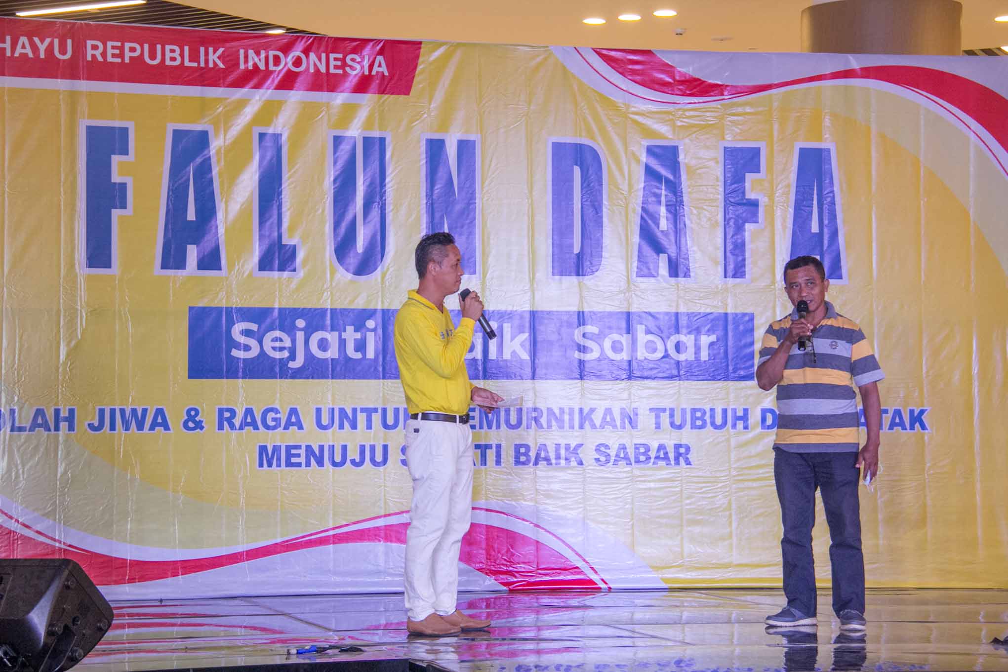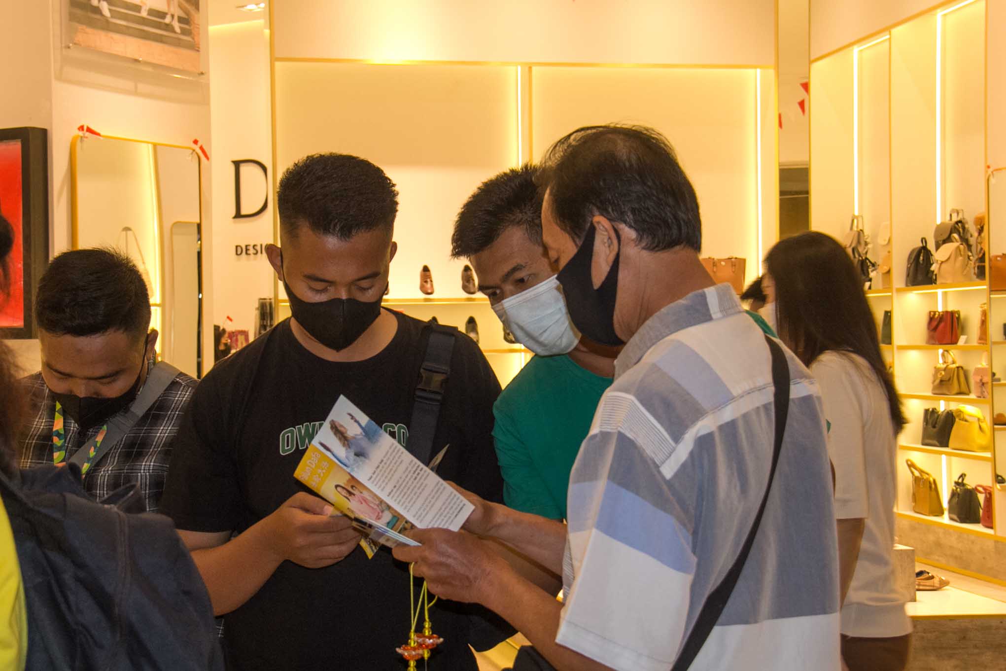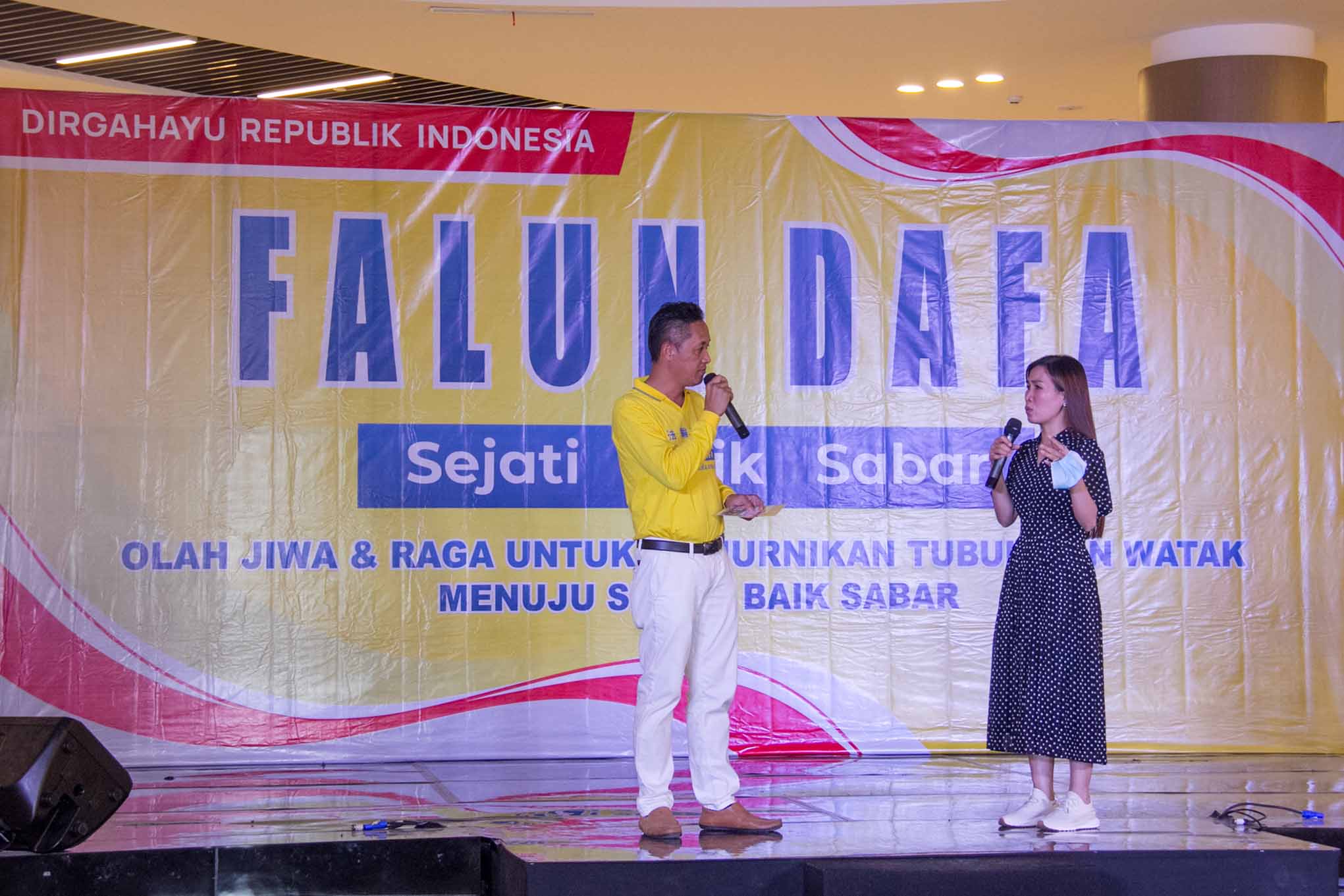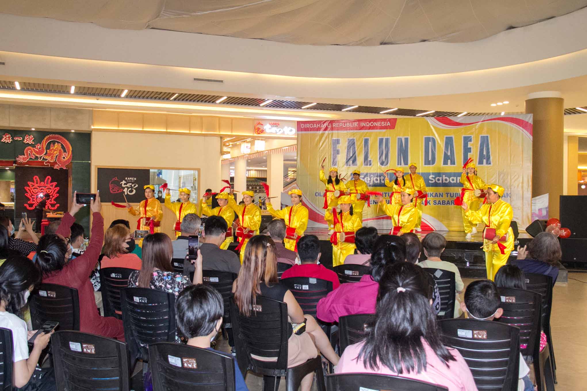 八月十三日星期六,在市中心新开张的购物商场(One Batam Mall)介绍什么是法轮大法,现场来宾一般都是正享受周末家庭团聚的观光客们。活动期间,学员们展示了法轮大法(又称法轮功)的五套功法。腰鼓队也演奏歌曲,传递法轮大法的福音。腰鼓队的独特击鼓声,吸引了商场的来宾,前来靠近舞台或找地方坐下观看。