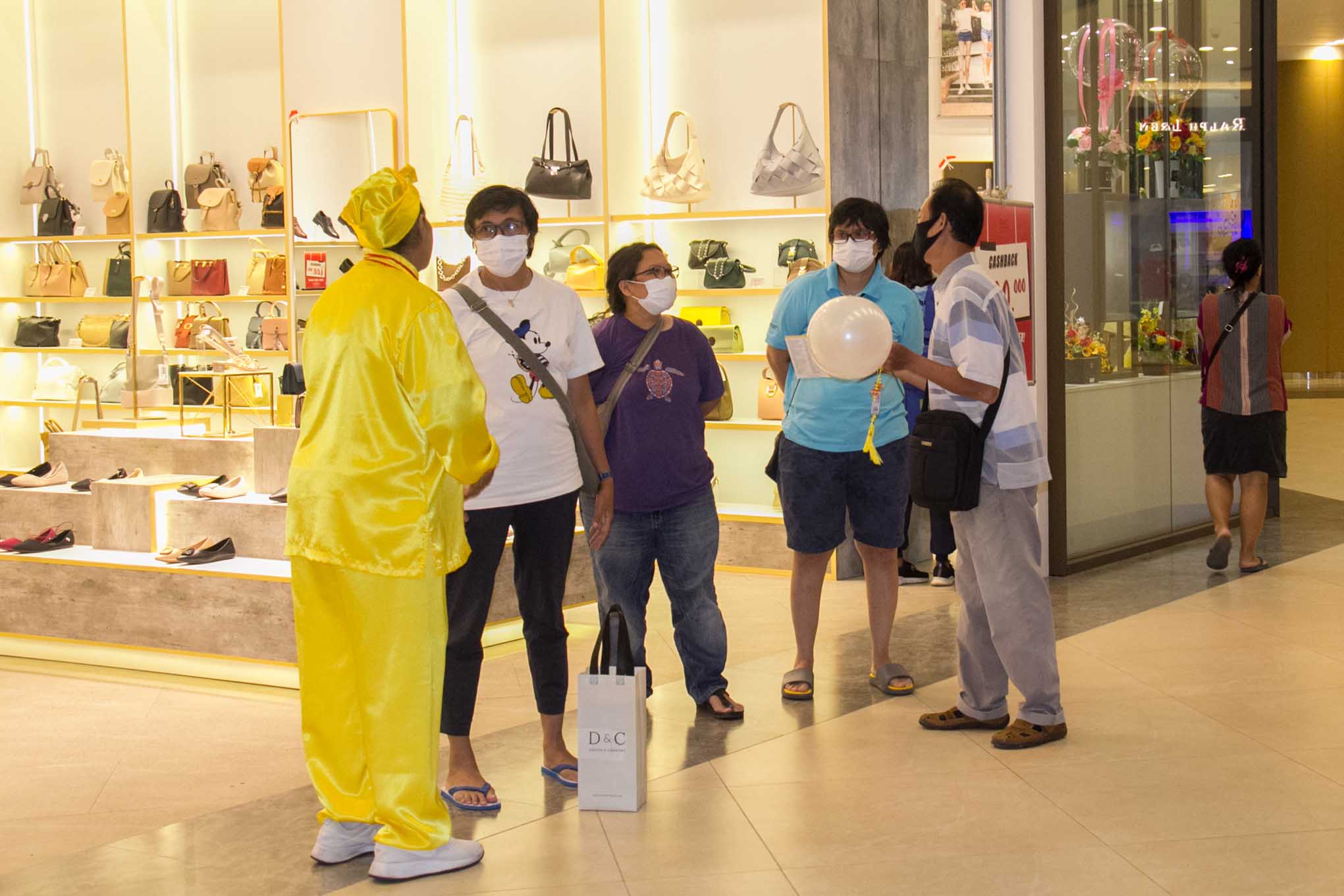 几位法轮功学员向商场的来宾们分发真相简介,在台上的司仪不断地简单介绍什么是法轮大法,以及法轮功在中国大陆被迫害的真相。