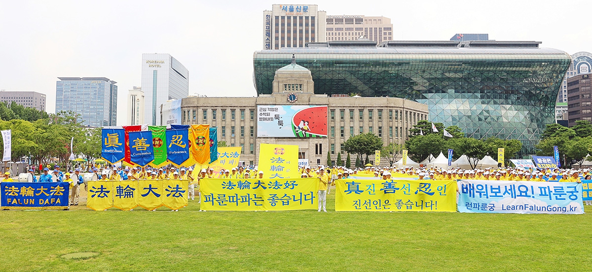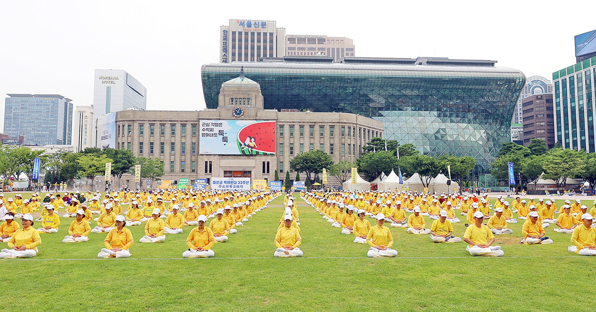 全国各地的法轮功学员七点开始陆陆续续到达首尔广场。活动于上午八时三十分开始,学员们集体演示了法轮功的五套功法。深绿色草地上,穿上白色裤子与黄色上衣炼功的学员,格外引人注目。很多市民在上班途中注视着充满能量的舒缓的炼功场面。