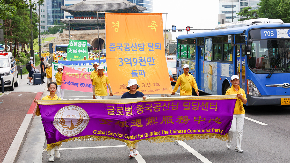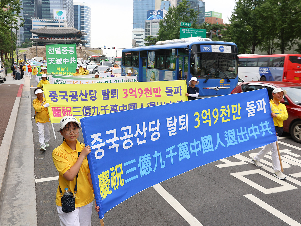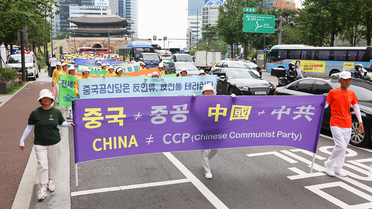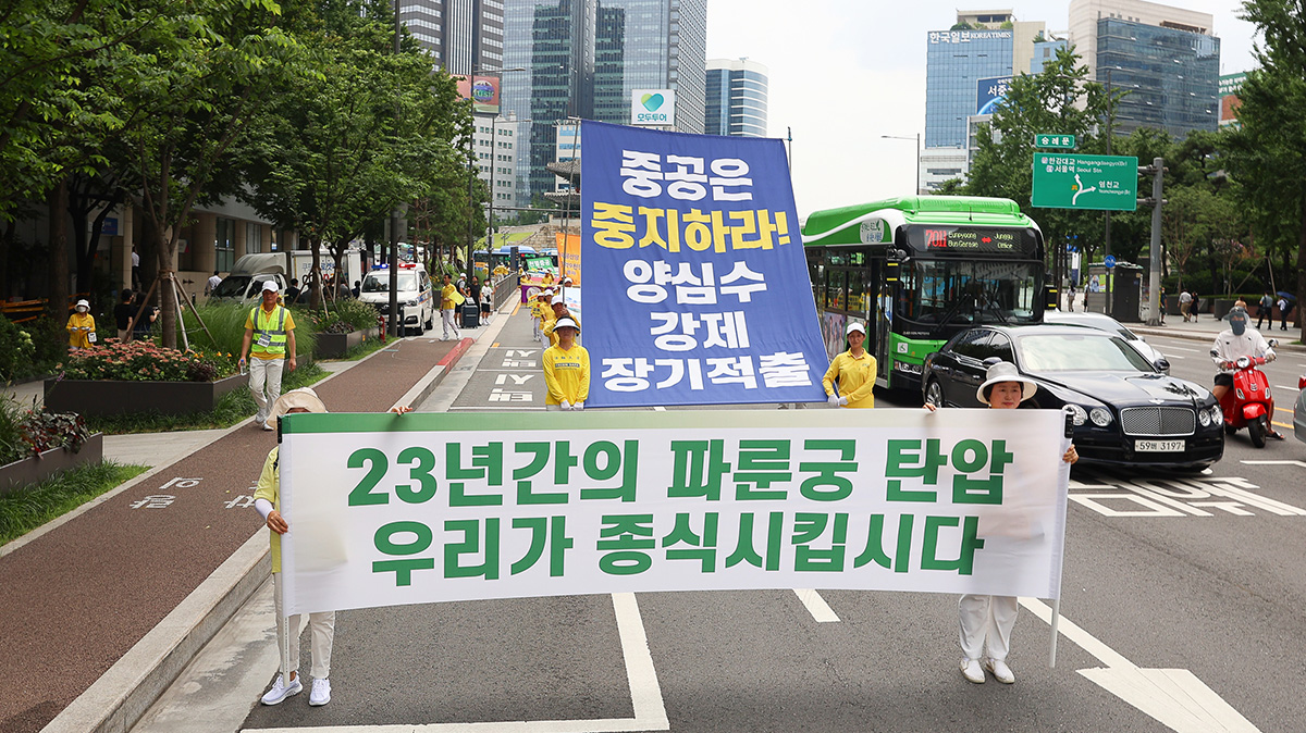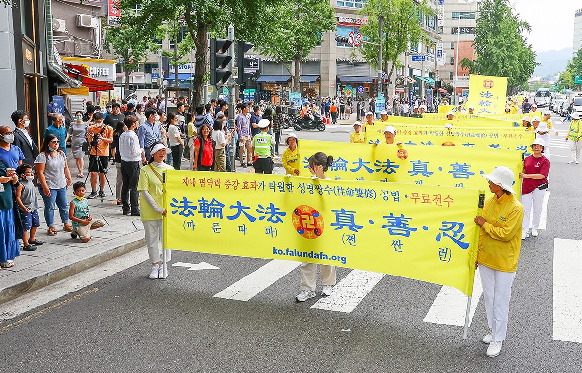 学员们走在首尔广场附近四千米的游行道路上,手拿五颜六色的旗子、大大小小的横幅,横幅上写着“法轮大法好”、“真善忍好”、“停止迫害法轮功”、“是时候结束迫害”等。法轮图形与《转法轮》一书的大模型也缓缓前进着,炼功示范阵、腰鼓队紧随其后。
