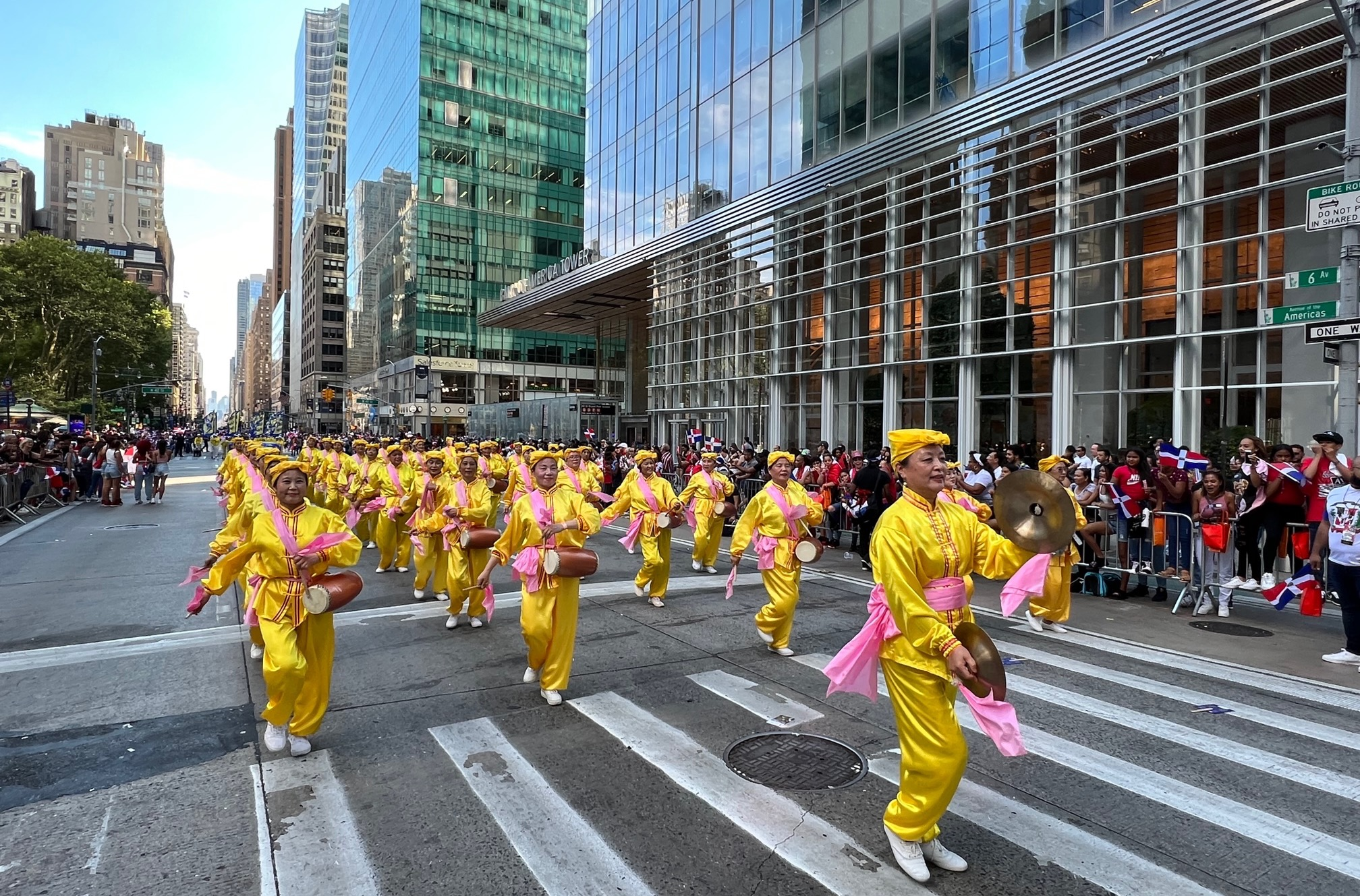 在经过主席台时,主持人介绍:这是法轮功队伍,感谢他们的参与!腰鼓队在主席台前停下来表演。弗里达·卡布雷哈(Frieda Cabreja)是多米尼加裔画家,看到法轮功学员的表演,她伴随音乐节拍挥舞国旗,并向法轮功学员双手合十和鞠躬,用中文说:“谢谢!”