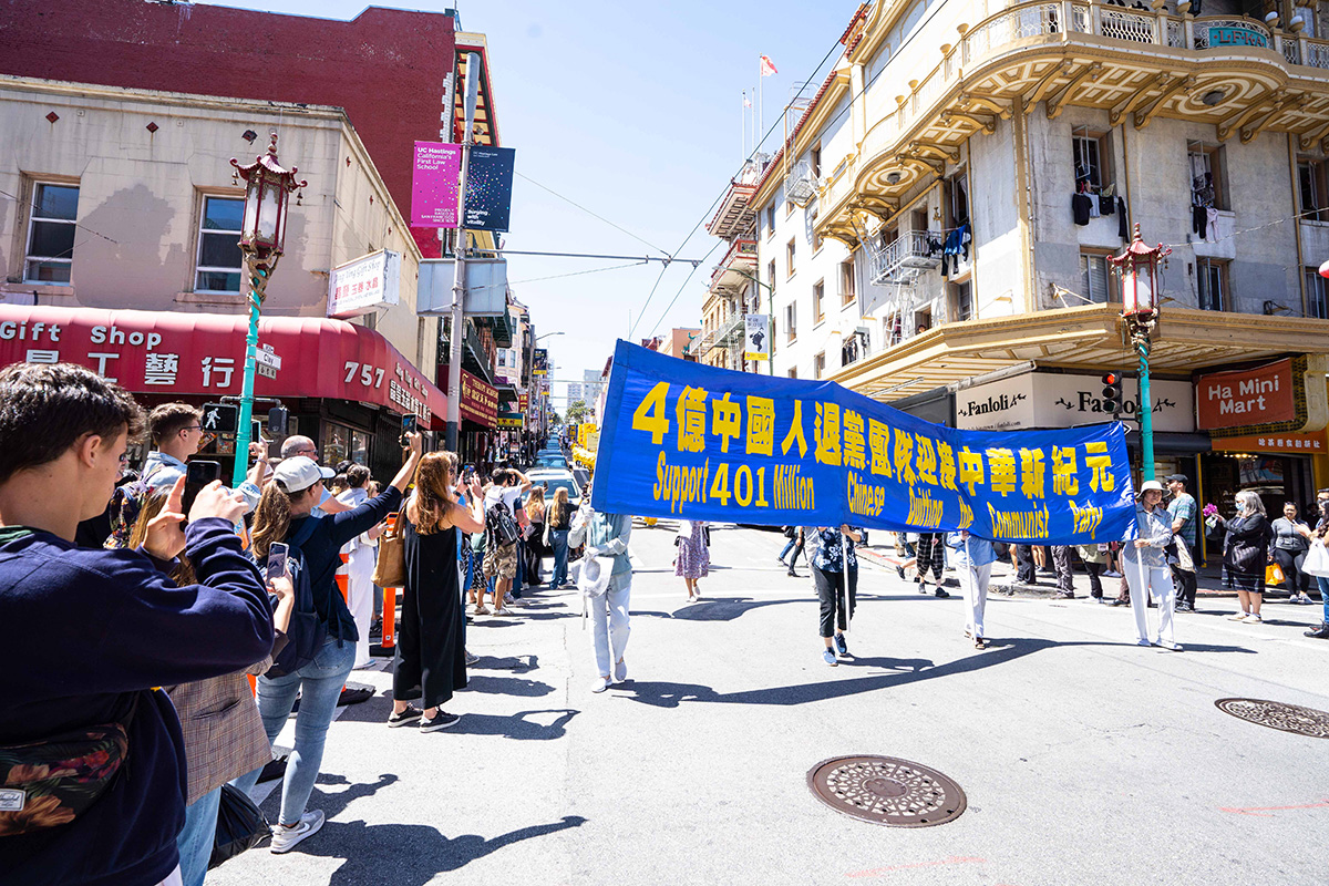 星期六上午十二点,庆祝的游行队伍组成方阵,从旧金山渡轮大厦出发,在旧金山主要街道游行,然后进入唐人街,最后抵达唐人街花园角广场。参加游行的民众呼吁中国同胞,认清中共本质,早日退出中共,获得美好未来。