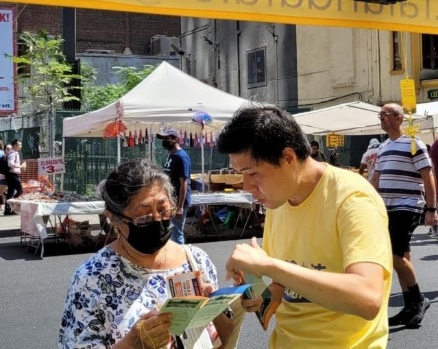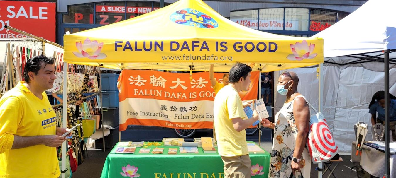 巴特里西奥(Batricio)和他的朋友在街头集市上漫步,玩得很开心。他们来到学员的摊位,停下来听学员讲解法轮大法功法。西人大法弟子详细的介绍了法轮大法,还有一些纽约市民通过大法弟子的介绍,很感兴趣,留下了自己的联系信箱,希望以后进一步了解大法。