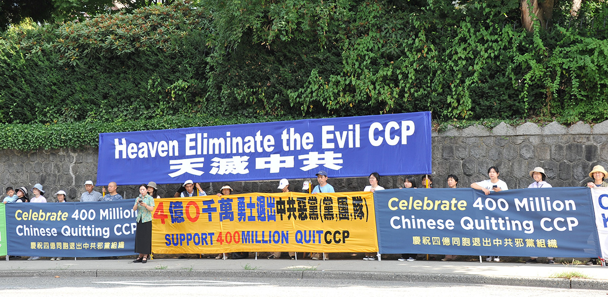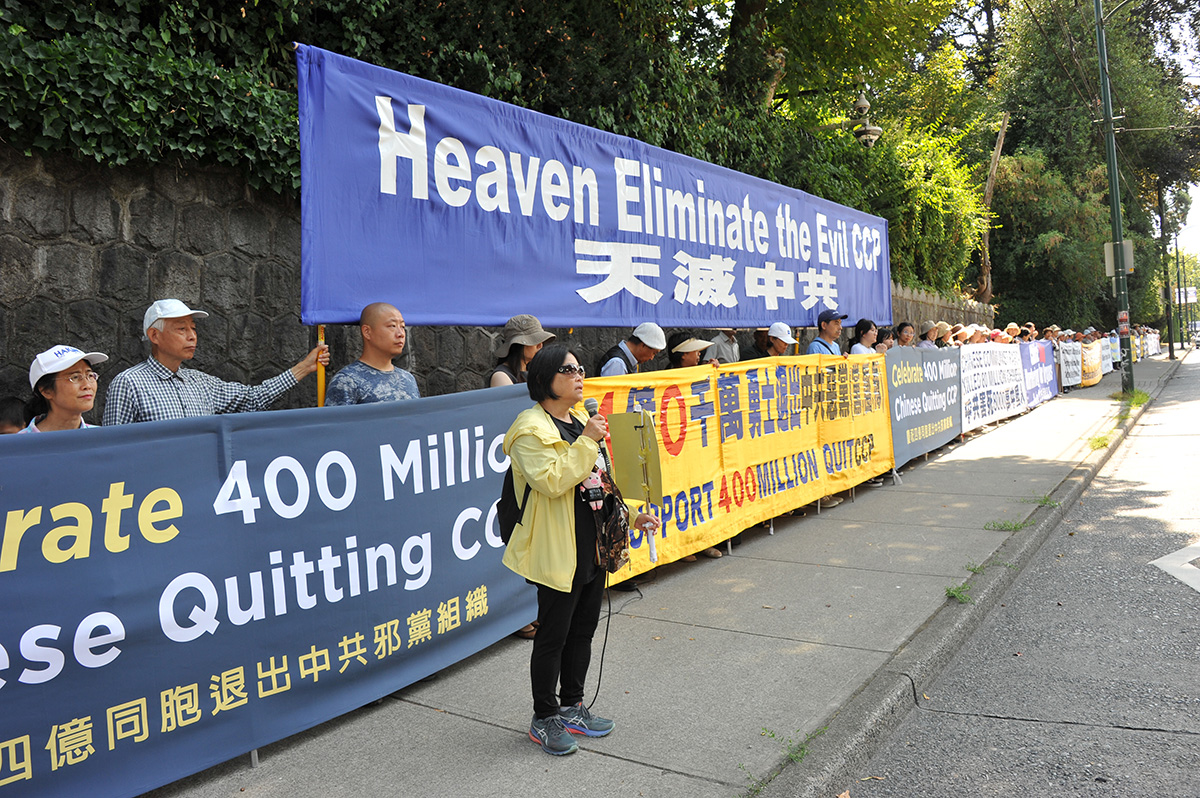 ![]() 图1:八月二十一日,温哥华民众在中领馆前集会庆祝四亿华人三退(退中共党、团、队)。 |