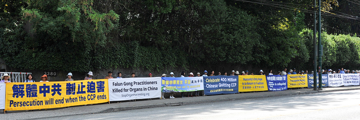 ![]() 图2:八月二十一日,温哥华民众在中领馆前集会庆祝四亿华人三退,图为集会现场绵延的横幅。 |
