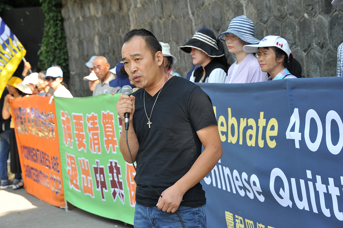 民主人士朱传和在集会现场说:“我由衷地感谢李洪志大师,能够唤醒我们这四亿、这四万万同胞退出中共党团队组织,这是一个非常了不起的壮举。”