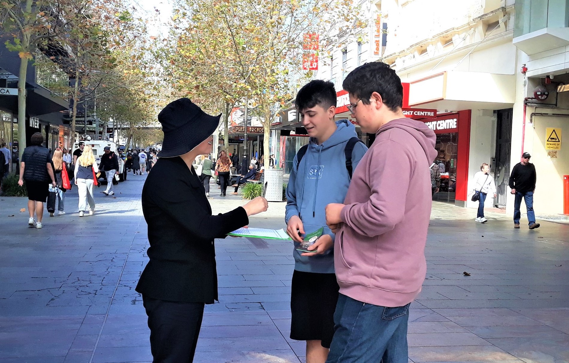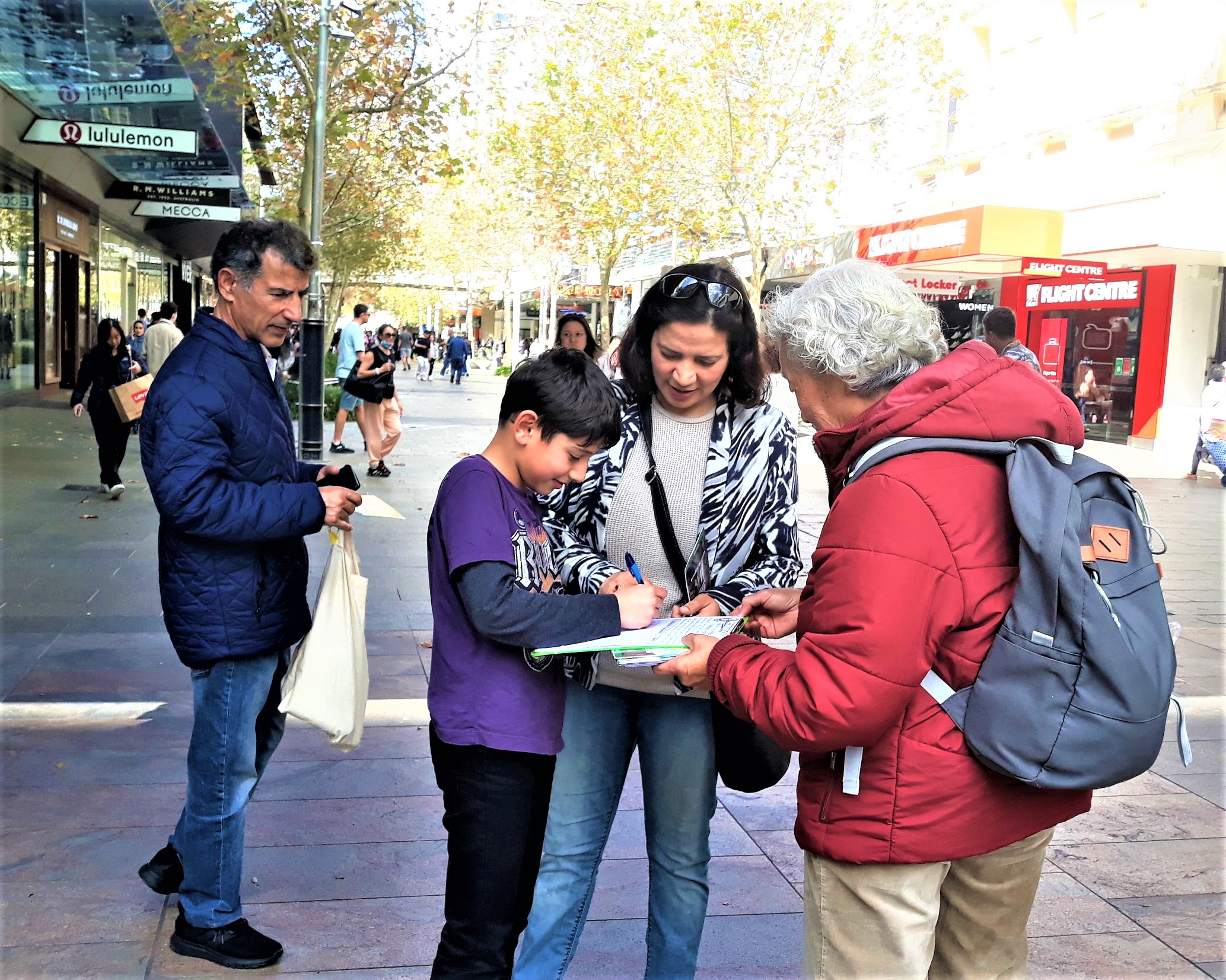 ![]() 图3~5:珀斯民众向法轮功学员了解真相 |