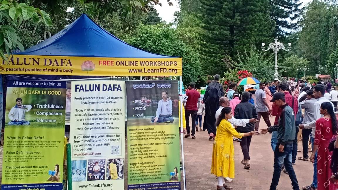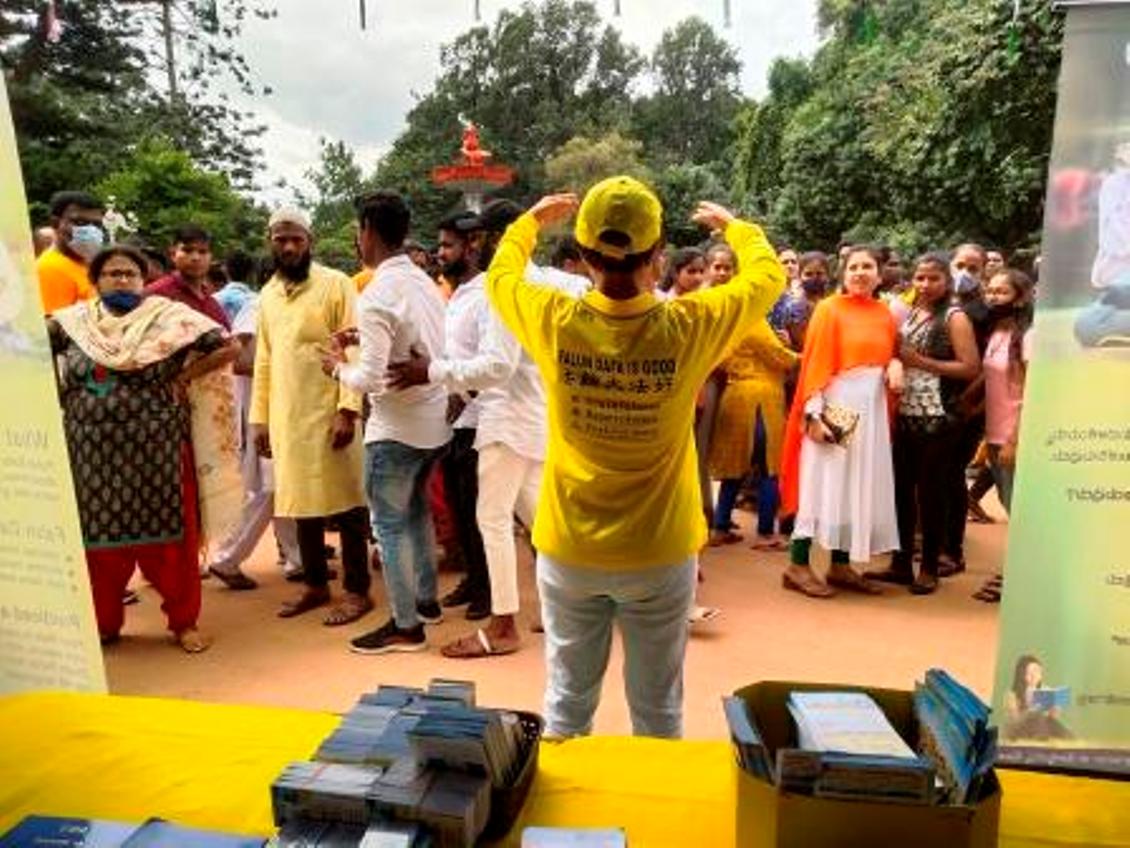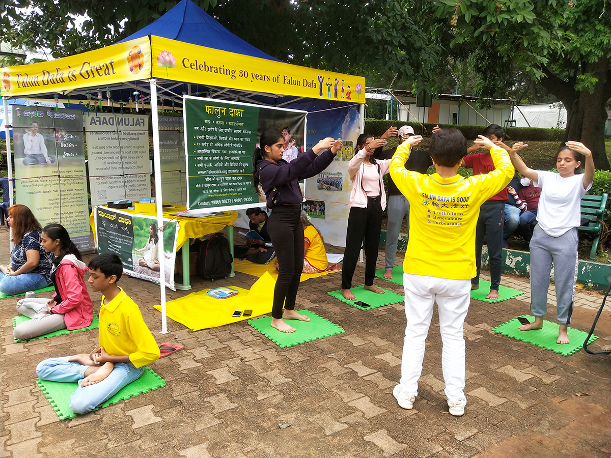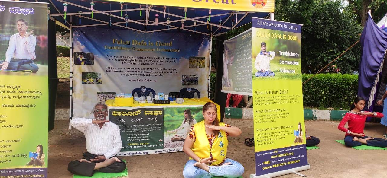 法轮功学员不断示范功法,派发真相传单和卡片。展位上提供英语、印地语、卡纳达语和泰米尔语的传单。许多拿传单或与学员交谈的人说,这是他们第一次听说法轮大法。