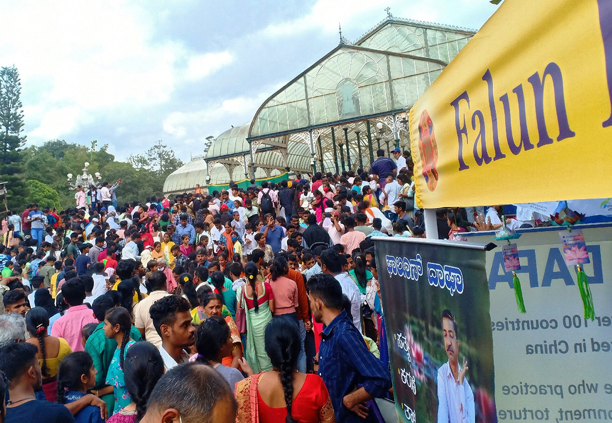 拉尔巴格中央公园占地260英亩,有四个大门。花展在拉尔巴格中心的玻璃屋举办。法轮大法展位设置在离花展入口很近的地方。法轮功学员与拉尔巴格的管理层密切互动,让他们通过尝试炼功和打坐感受大法的美好,也让他们了解法轮大法修炼者在中国遭受的迫害,他们对法轮大法修炼者的志愿工作非常重视。
