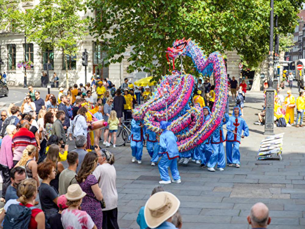 学员们在圣马丁广场展示了多面横幅,向民众传达活动的重要信息。并有腰鼓队、舞龙队的表演,和法轮功的功法展示,庆祝四亿中国人从心灵上抛弃中共,摆脱枷锁,拥抱自由新生!
