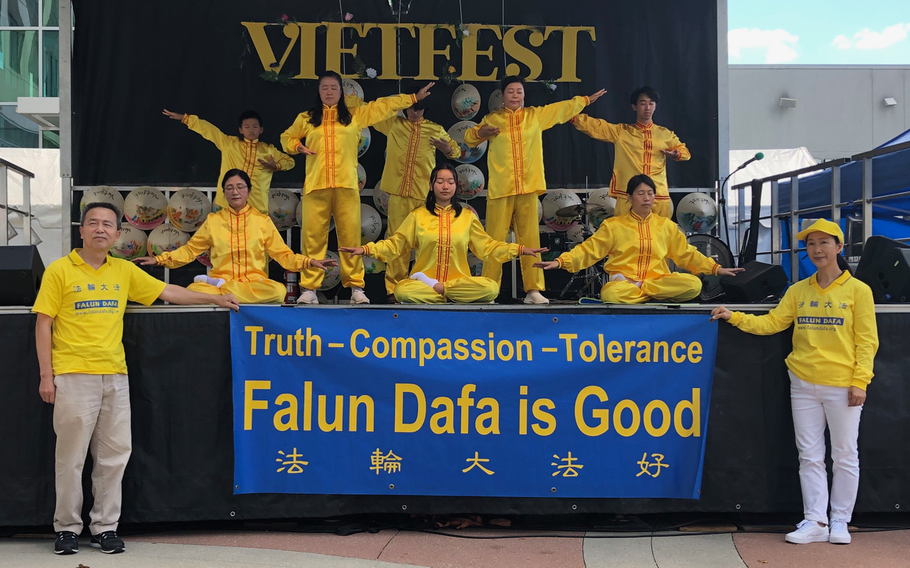 ![]() 图1:艺术节上法轮功学员的功法展示 |