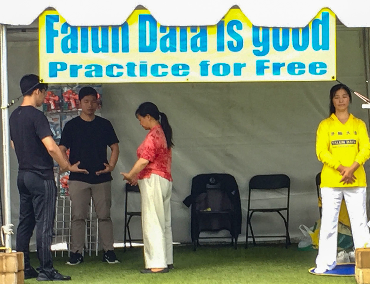 活动快要结束时,一位年轻的中国女孩走过来,直接说:“我要学法轮功。”并且自我介绍说自己才二十五岁,在美国压力很大,都有白头发了。所以,她想到要学法轮功。并且也得到国内母亲的支持。她是随公司来参加这次活动的,遇到学员们非常高兴。