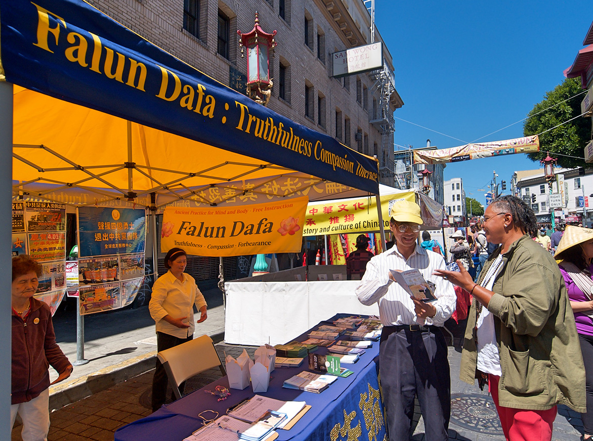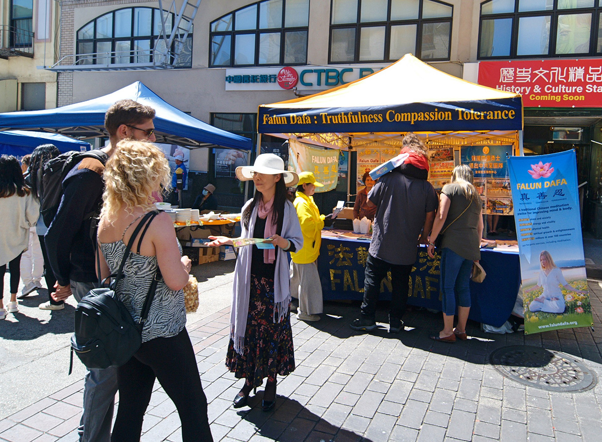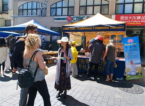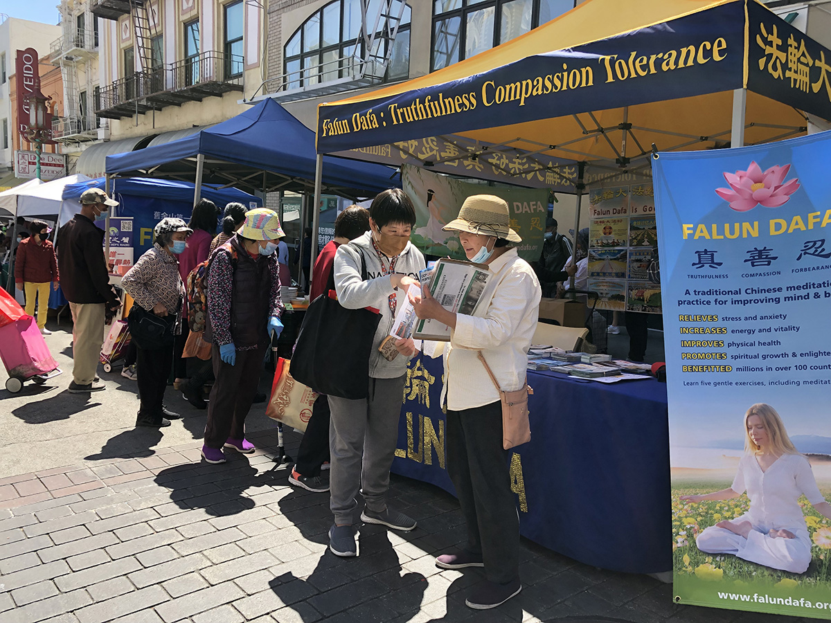 还有一位从中国大陆来的姓江的女士,来到摊位就把摆放在展桌上的资料都看了一遍。学员问她三退了没有。她回答:退了。还说:法轮功好啊。学员问她是怎样了解法轮功的。她回答,自己刚从大陆来的时候,对法轮功有疑惑,不相信;但看了《转法轮》后,她才明白原来法轮功这么好。学员问她为什么认为法轮功好。她回答:我看书后,心胸宽广了。我以前跟人斤斤计较,现在不那样了。而且我发现不跟人斤斤计较后,我的心情也舒畅了,人也舒服了。临走前,她拿了最新一期的《天地苍生》杂志,还拿了其他一些真相资料要给她的朋友看。