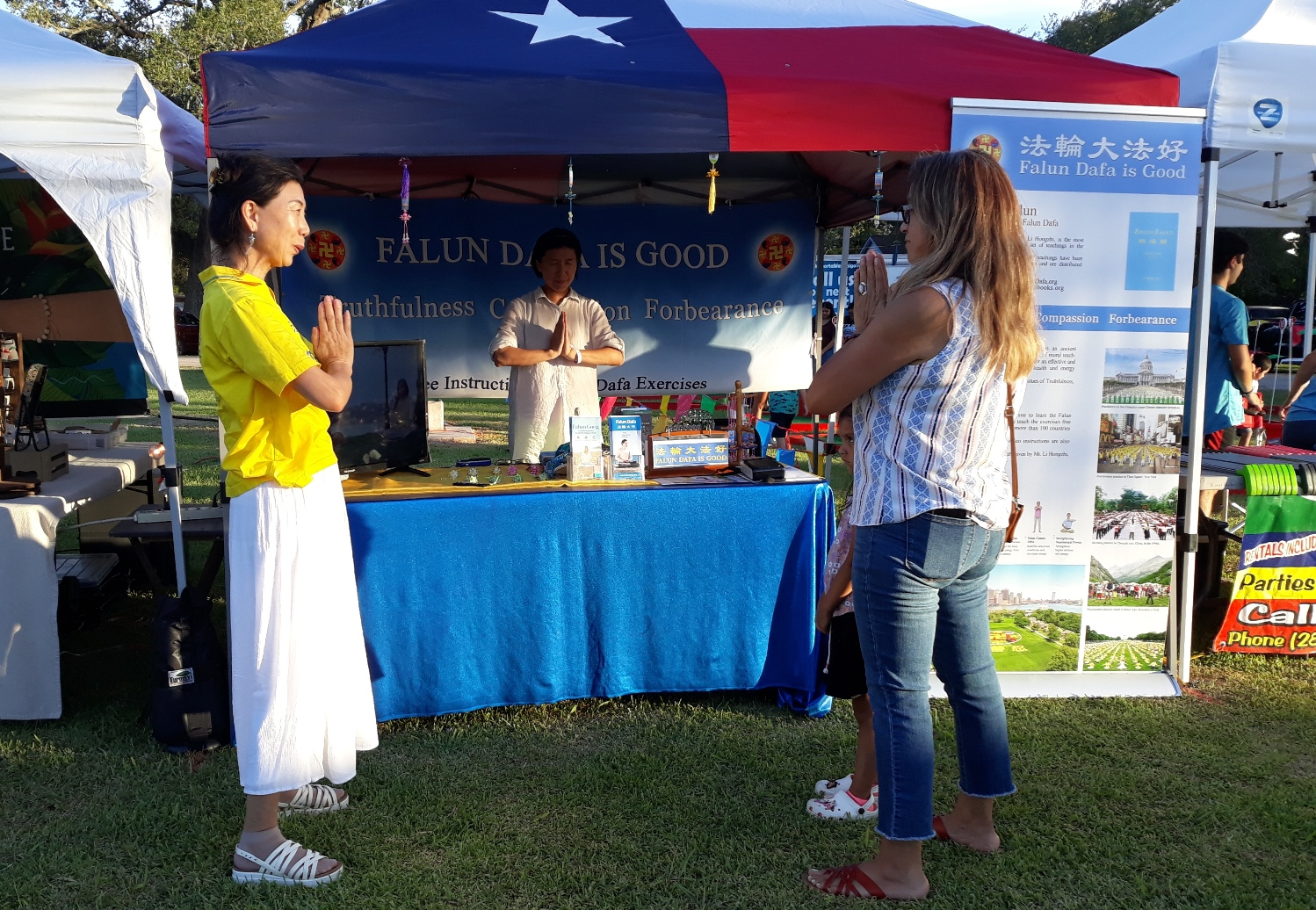 还有一位卖饮料的摊主,学员送给她一个印有“真善忍”和“法轮大法好”的卡片,告诉她在遇到困难时念上面的字可以得到神的护佑(Blessing)。这位摊主听了很高兴。她说她下周一要去医院做手术,她正在为这件事烦心呢,感到很无助,看她眼泪都要掉下来了。学员告诉她念卡片上面的字,一定对她有帮助的。还告诉她可以来我们的展位了解更多信息,或访问我们的网站。