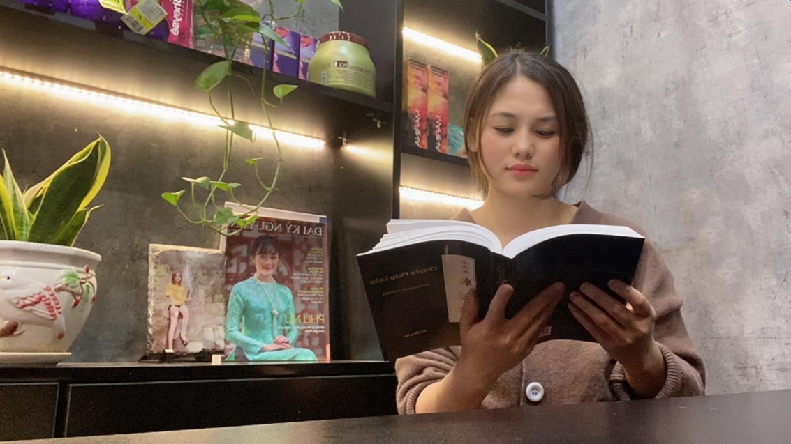 ![]() 图1:越南河内的美发店老板陈宝贷(Bao Loan)女士在看越南文版《转法轮》 |