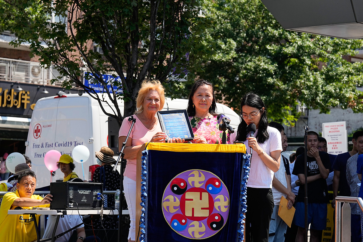 ![]() 图9:社区领袖玛莎(左)在集会上,为全球退党服务中心颁奖。 |