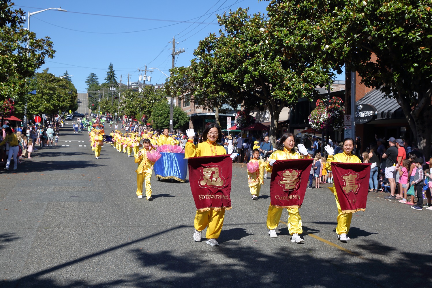 周六上午,游行开始。法轮功学员的游行队伍由手持中英文“法轮大法 Falun Dafa”横幅的学员打头阵,紧随其后的是“真”、“善”、“忍”横幅和手捧莲花的大法小弟子。由数十名学员组成的腰鼓队是游行队伍的核心。腰鼓队员们身着明黄色炼功服,为观众们表演了《法轮大法好》、《喜庆》等乐曲。每支乐曲结束,观众们都会热烈鼓掌喝彩。