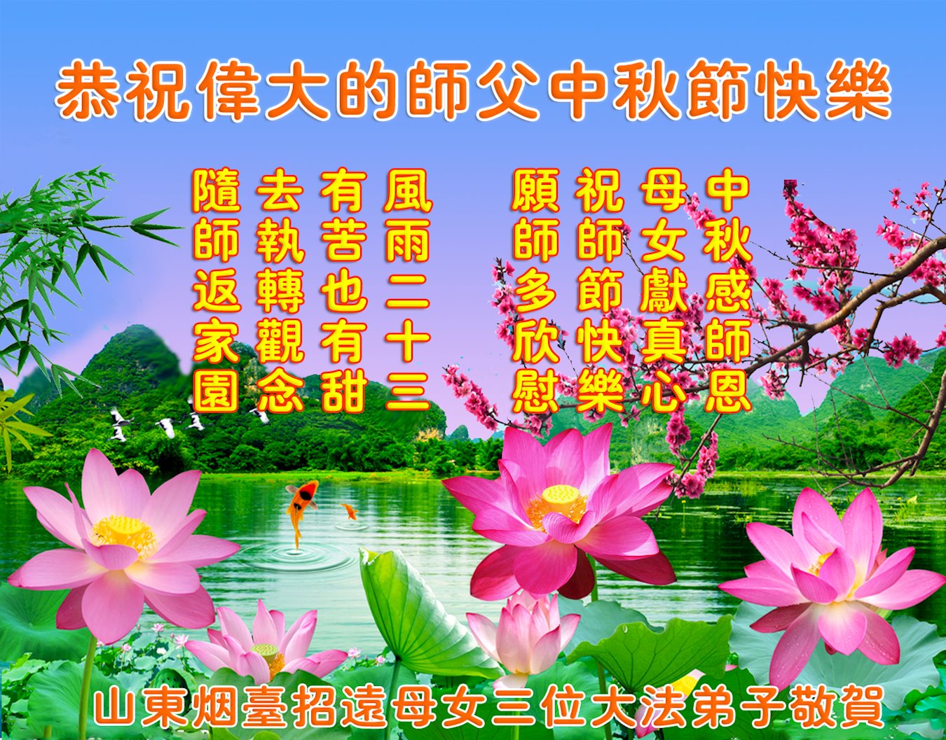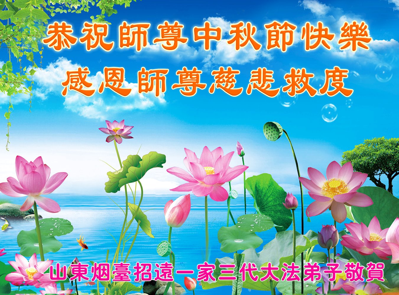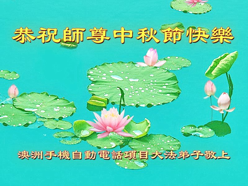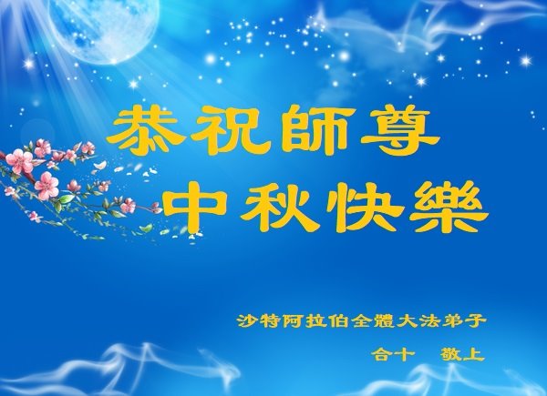 世界各国大法弟子们恭祝慈悲伟大的师尊中秋好!下面是部份来自新西兰、德国、柬埔寨、澳大利亚、越南、中国、台湾、香港、日本、马来西亚、韩国、泰国、英国、芬兰、荷兰、奥地利、爱尔兰、加拿大、厄瓜多尔、法国、丹麦、瑞典、俄罗斯、美国、加蓬、印尼、罗马尼亚、瑞士、斯洛伐克、阿联酋、沙特阿拉伯、巴西、菲律宾、新加坡、澳门、比利时、西班牙、塞尔维亚、希腊、克罗地亚、挪威、波兰、乌克兰、伊朗、葡萄牙、波黑等46个国家和地区的大法弟子对慈悲伟大的师尊的诚挚问候。