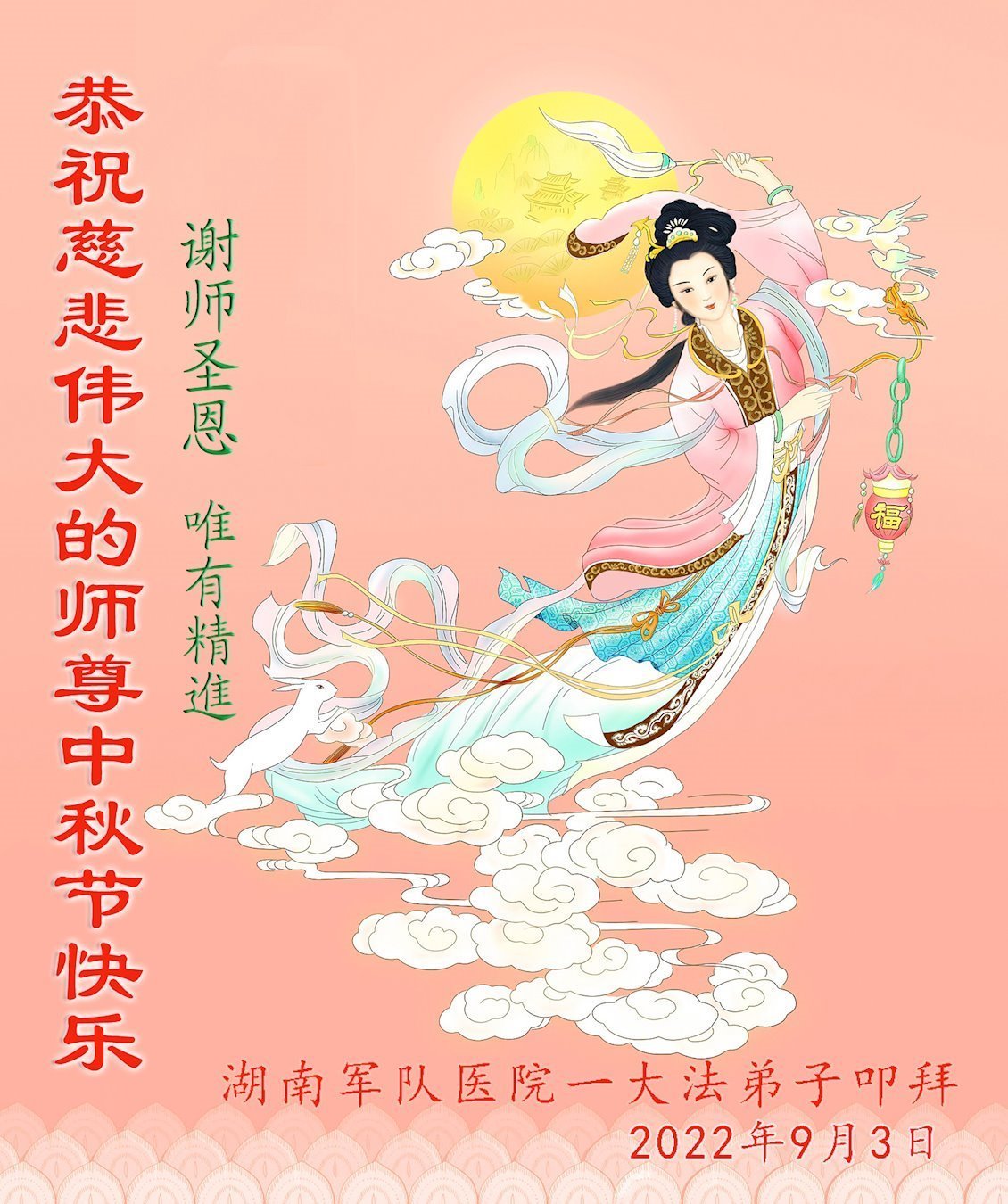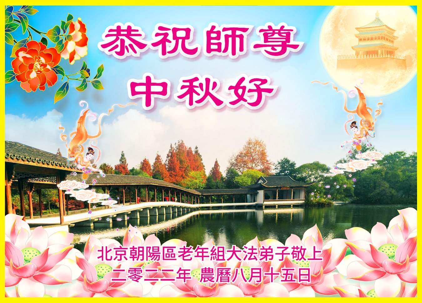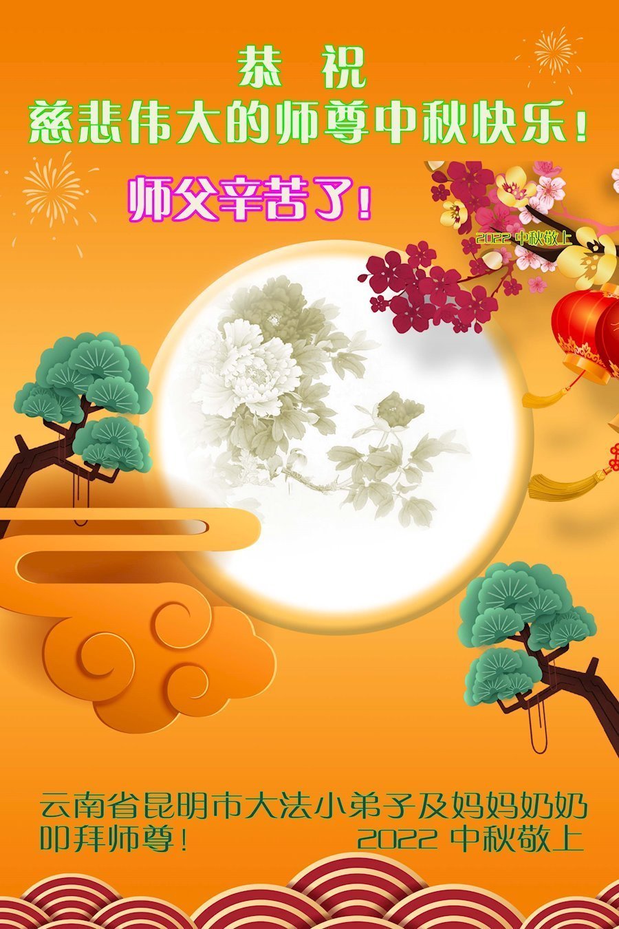 【明慧网二零二二年九月十日】(明慧网记者综合报道)壬寅年中秋佳节到了,中国各地公、检、法、司、军队机构的大法弟子的一张张美丽的贺卡飞向海外明慧网,恭祝师父佳节快乐!感恩师父的慈悲救度,并向师父表达弟子们坚修大法直至圆满的信心。