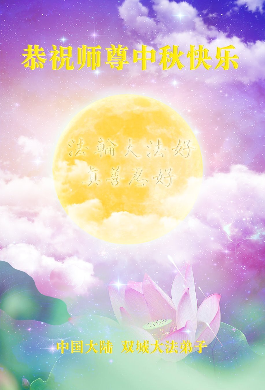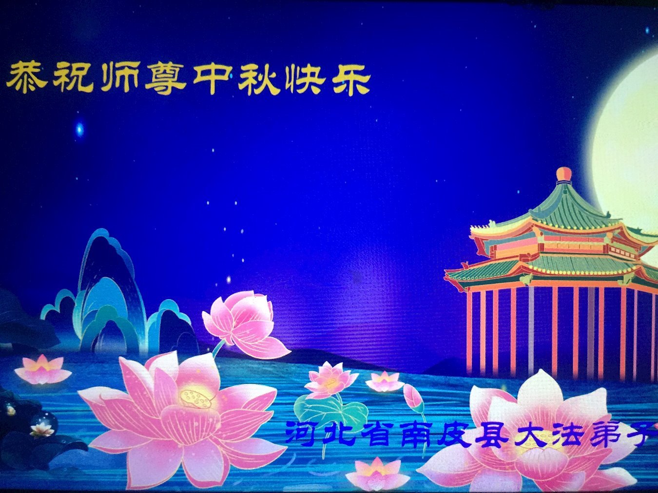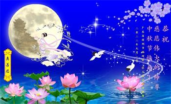 在这中秋佳节明月高悬之时,全世界的大法弟子更加思念我们慈悲伟大的师尊李洪志先生。大法洪传三十年,亿万大法徒在师尊的保护下,返本归真,助师正法,走过了阴霾密布的中共二十三年残酷迫害,大法弟子就象一朵朵圣洁的莲花,在世界各地竞相开放,讲真相、传播大法的福音,使各国人民沐浴在法轮大法的佛光普照之下。