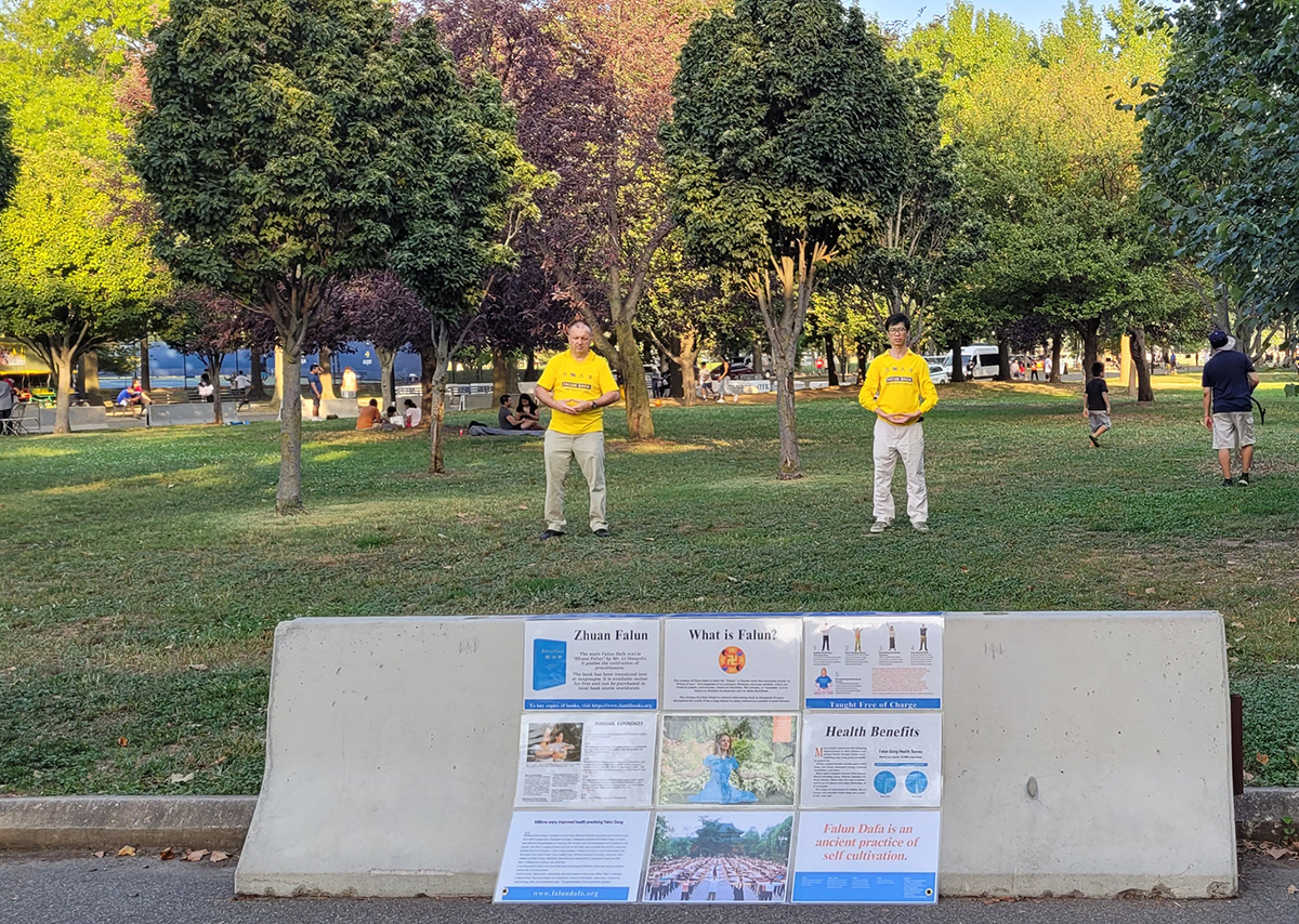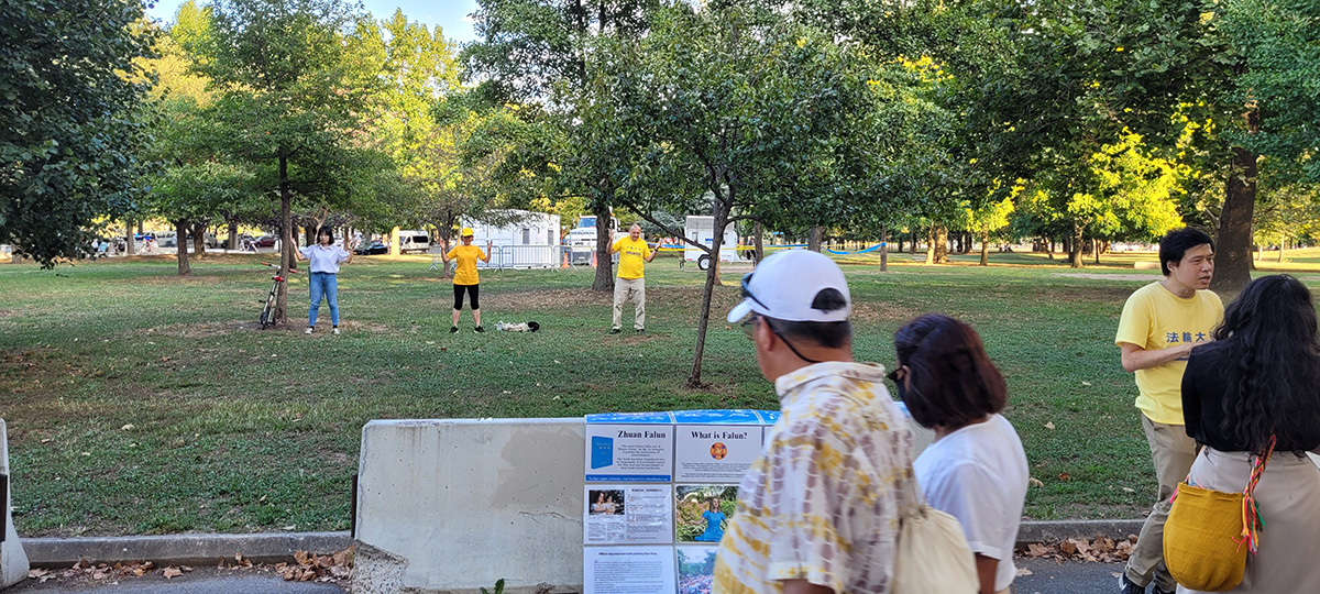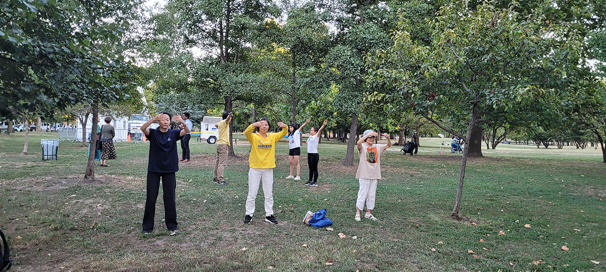 法轮功学员也借此在该公园的草地上,和平地炼功,并向路人散发宣传册。法轮功修炼者平和炼功的场景,往往引起路过人们的注意。很多人会驻足观看法轮功打坐,拍照或询问什么是法轮大法。学员们会向他们讲解什么是法轮大法,分享自己对法轮大法的理解和个人修炼心得。学员还和感兴趣的人们一起炼功,打坐。