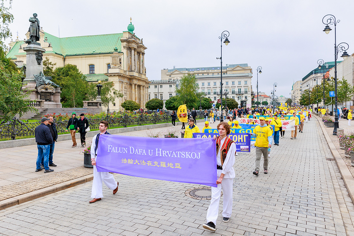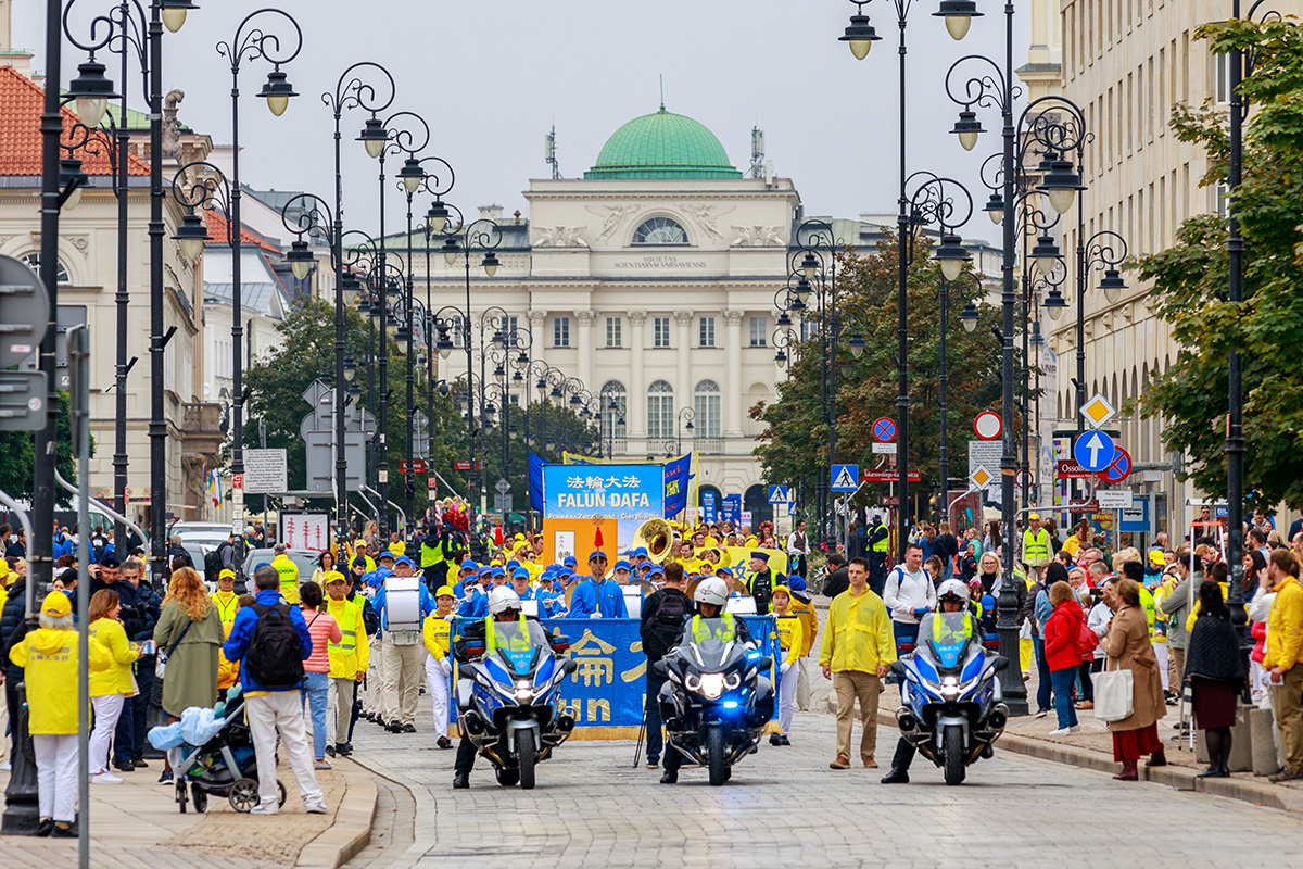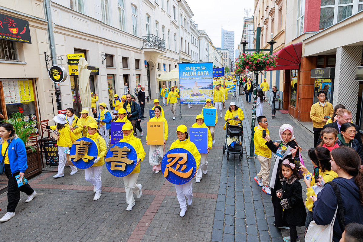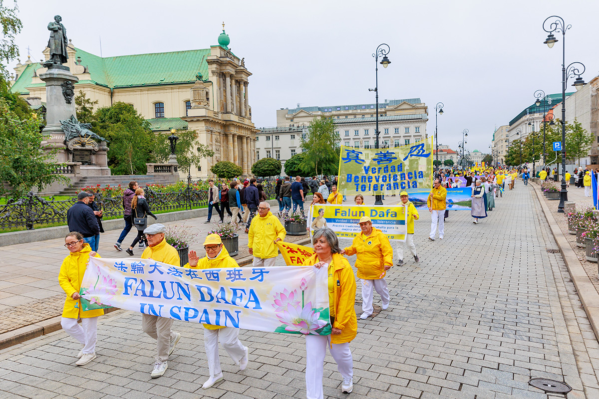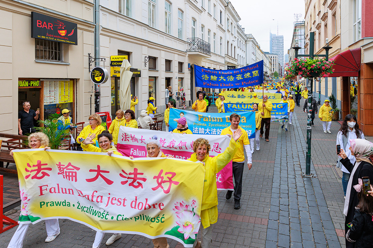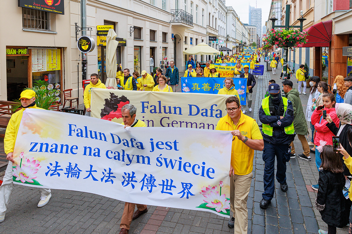 二零二二年九月十日,在华沙一所大学任教的玛丽亚·维克(Maria Wek)在街上看到来自三十五个国家的法轮功学员游行队伍,她请先生拍照留念,并给约七、八岁的儿子讲解横幅上的内容。法轮功学员长长的游行队伍穿过大街小巷,最后到达热闹的古城区,一路上吸引了众多路人,他们纷纷拍照,录像,记录下这特殊的场景。