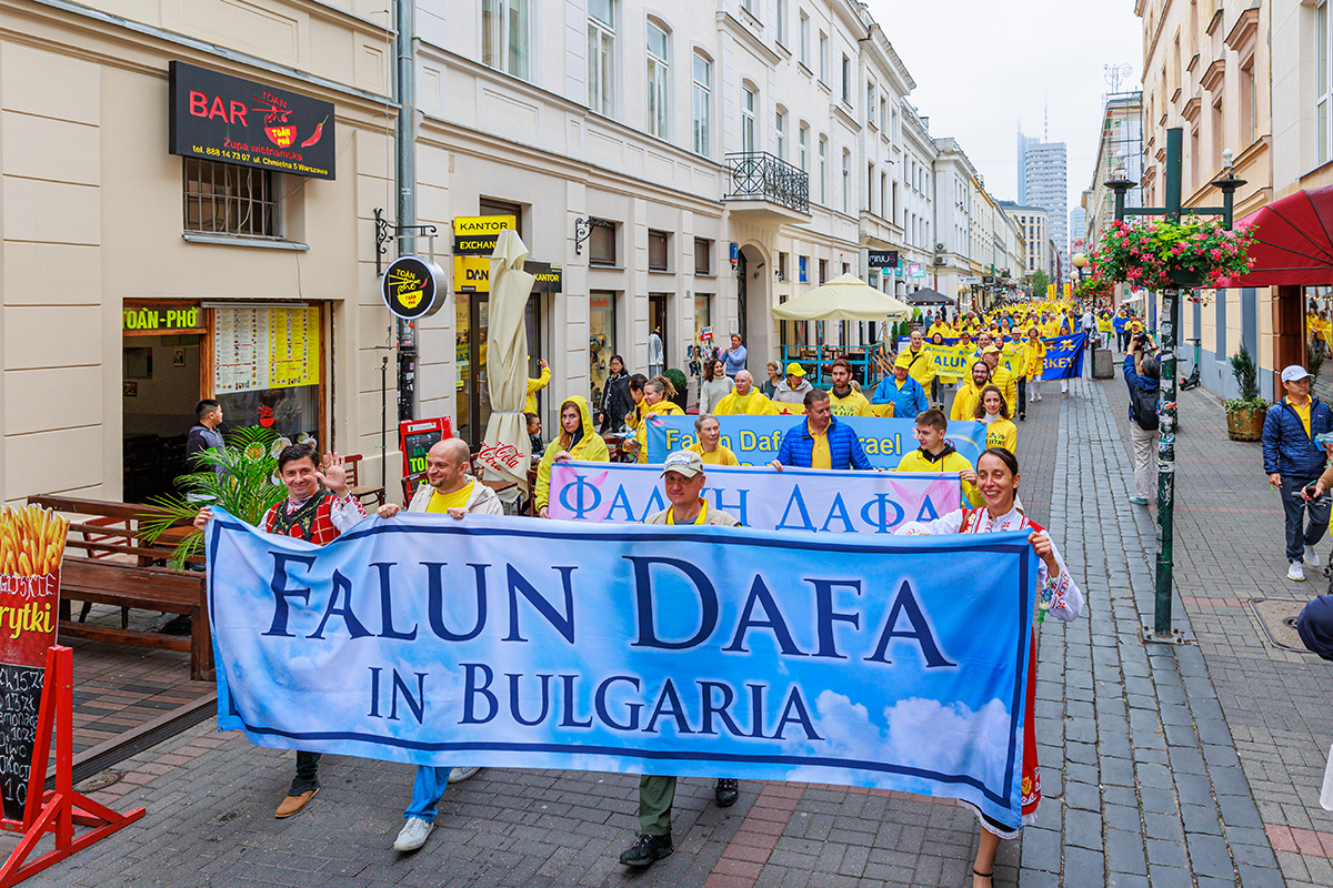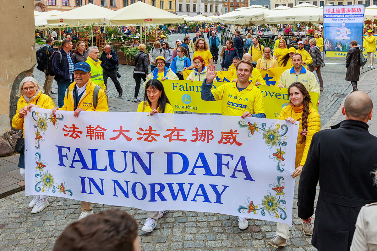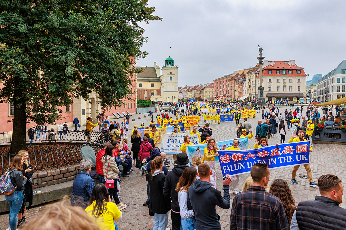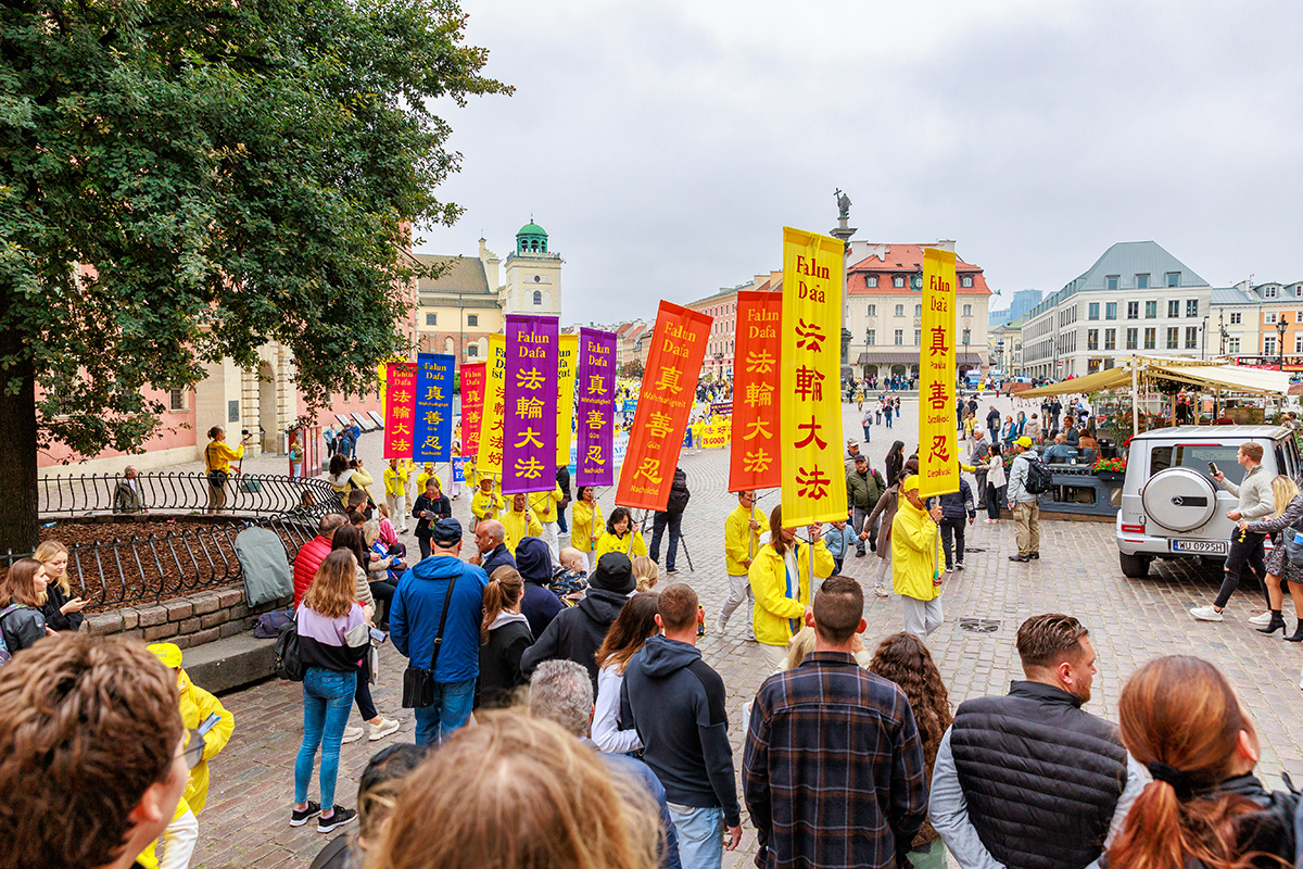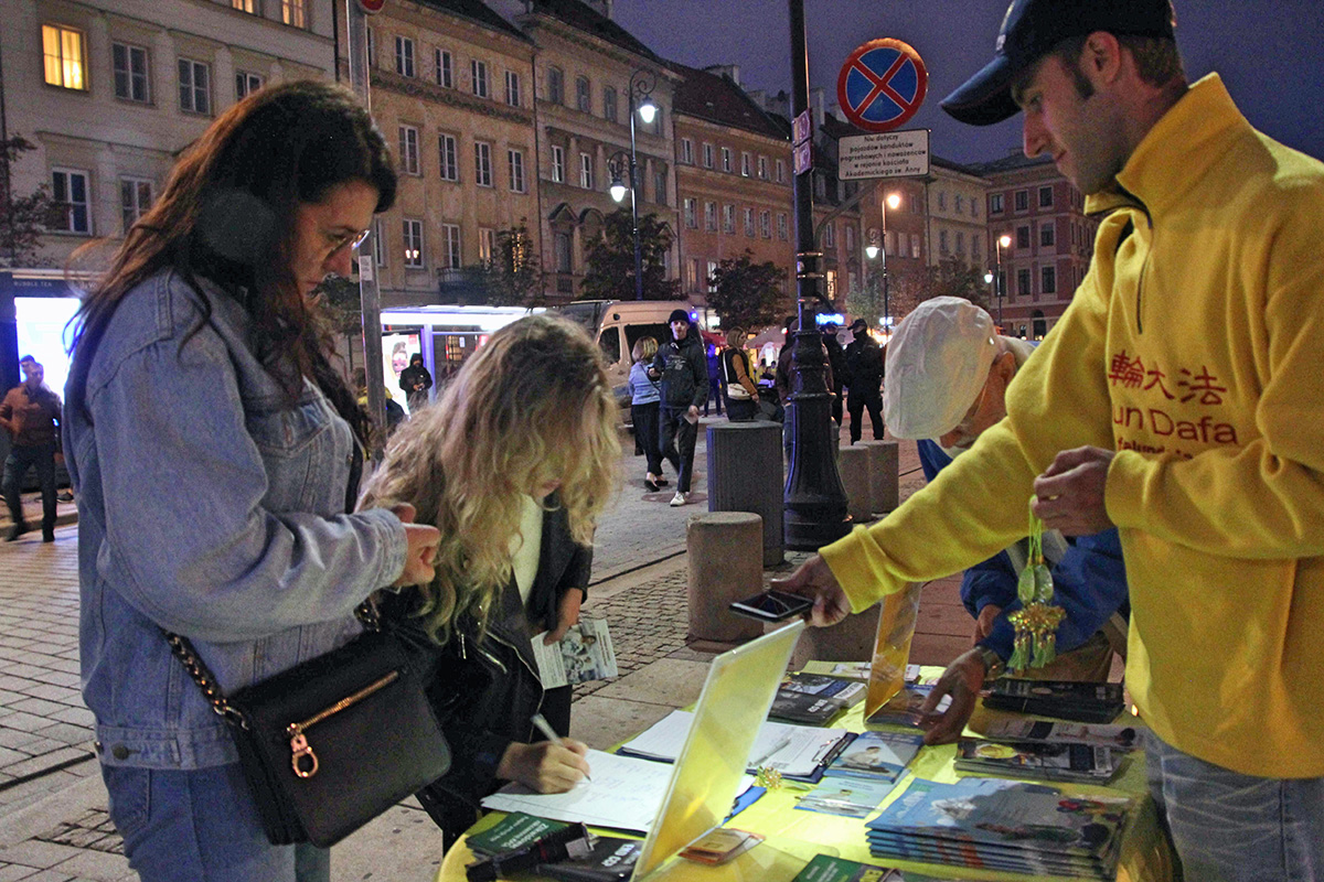 傍晚时分,夜幕降临时,法轮功学员在古城区的集体炼功及烛光守夜也吸引了众多路人,他们借着路灯及手电筒的微弱灯光签名表达自己的支持。很多波兰人谈到自己支持法轮功学员反迫害,也因为他们自己经历过这样的与共产党政权的抗争。有观众说:“非常感谢你们来到波兰,选择我们华沙作为你们的会议地点,非常欢迎你们!”