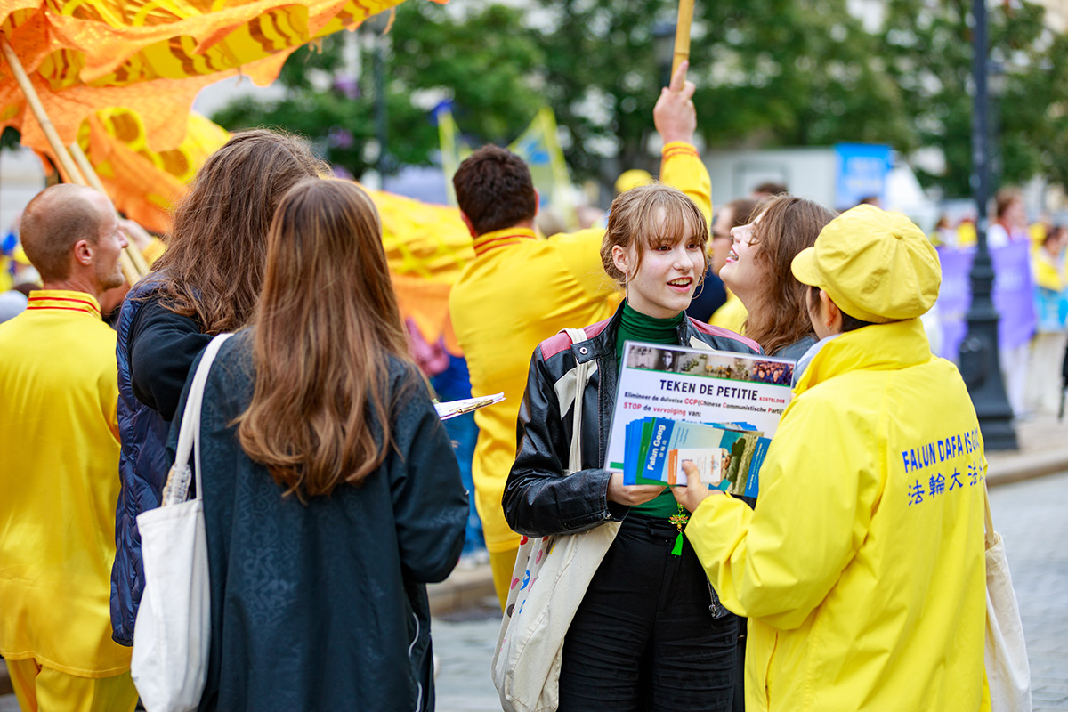 安娜(Anna)和来自英国的蜜雪儿(Michaele)在游行出发前就看到了法轮功学员准备的团队,感到非常漂亮,也从分发真相资料的学员那里了解了法轮功的相关讯息。